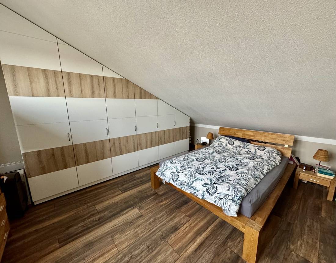 Die Einliegerwohnung verfügt über eine Wohnfläche von 137,12m² und befindet sich ab dem 01.01.2026 im vermieteten Zustand. Im Obergeschoss gelangt man über das Treppenhaus in den Flur der Wohnung. Der Flur führt in alle Räumlichkeiten des Obergeschosses. Neben der großzügigen Wohnküche befinden sich im Obergeschoss das Badezimmer, das Gäste-WC, ein Abstellraum und ein Schlafzimmer. Sowohl die Wohnküche als auch das Schlafzimmer, führen auf den überdachten Balkon. Das Dachgeschoss beinhaltet neben dem Flur zwei weitere Schlafzimmer.