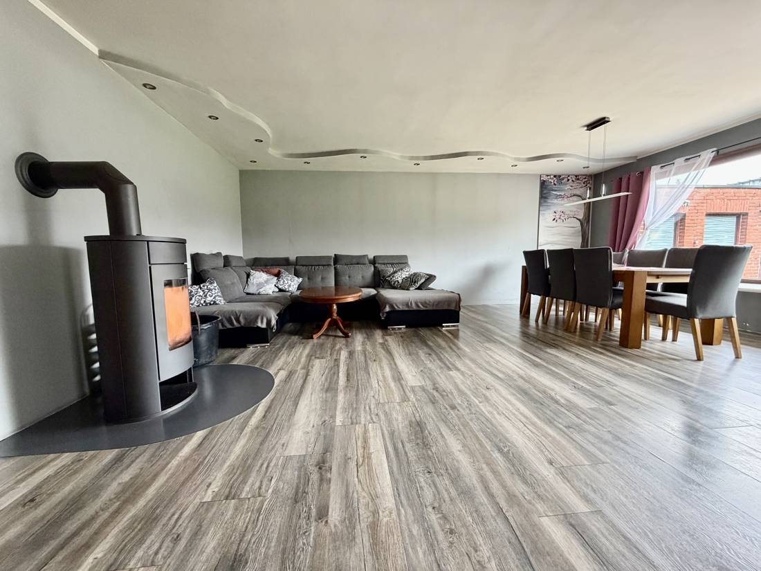 Geradeaus erwartet Sie der helle und großzügige Wohn- und Essbereich, der mit seinem Kamin eine behagliche Atmosphäre schafft und zu gemütlichen Stunden einlädt. Direkt angrenzend befindet sich ein Wintergarten, der zusätzlichen Wohnkomfort bietet und den Raum mit viel Tageslicht erfüllt. Ebenfalls auf dieser Ebene liegt das geräumige Elternschlafzimmer. Abgerundet wird das Erdgeschoss durch die Küche, sowie ein Badezimmer.