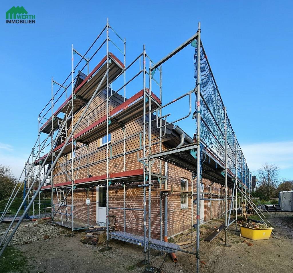 Die Baufertigstellung wird im Frühjahr 2026 erwartet. Praktisch: Die Doppelhaushälfte hat Ausgänge an drei Hausseiten.
