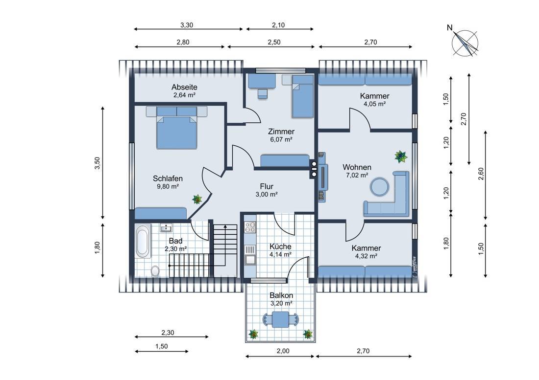 Das Dachgeschoss überzeugt ebenfalls mit einer vollständigen Wohneinheit bestehend aus Wohnzimmer, zwei weiteren Zimmern, einer Küche, einem Flur und einem Badezimmer. Ein Balkon sorgt für zusätzlichen Wohnkomfort und lädt zum Verweilen ein. Zwei praktische Kammern bieten viel Stauraum und können entweder zu einem begehbaren Kleiderschrank umgestaltet werden oder durch das Entfernen der Wände zu einem großzügigen Zimmer zusammengeführt werden. Auch hier zeigt sich die Flexibilität dieser Immobilie, die sich mühelos an individuelle Wohnwünsche anpassen lässt.