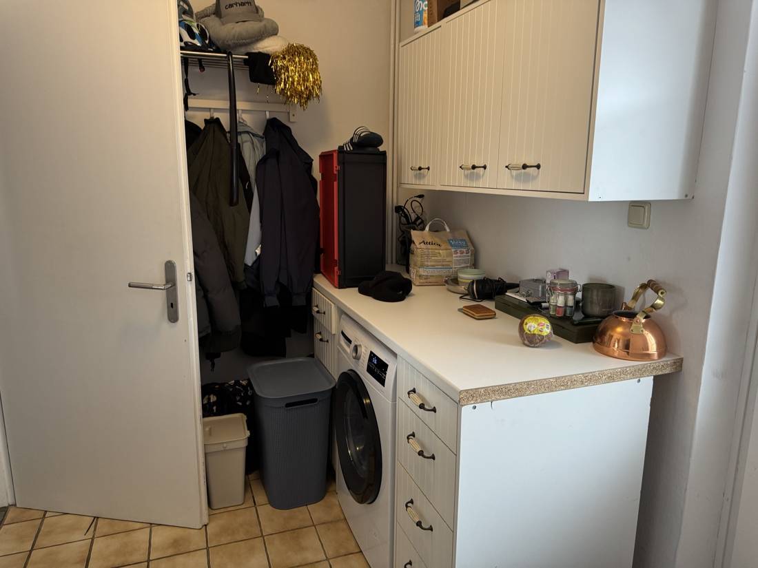 Ein weiteres Zimmer auf dieser Ebene wird derzeit als Schlafzimmer genutzt. Ergänzt wird das Raumangebot durch einen Hauswirtschaftsraum, der vom Flur aus zugänglich ist und gleichzeitig die Verbindung zum Badezimmer herstellt.