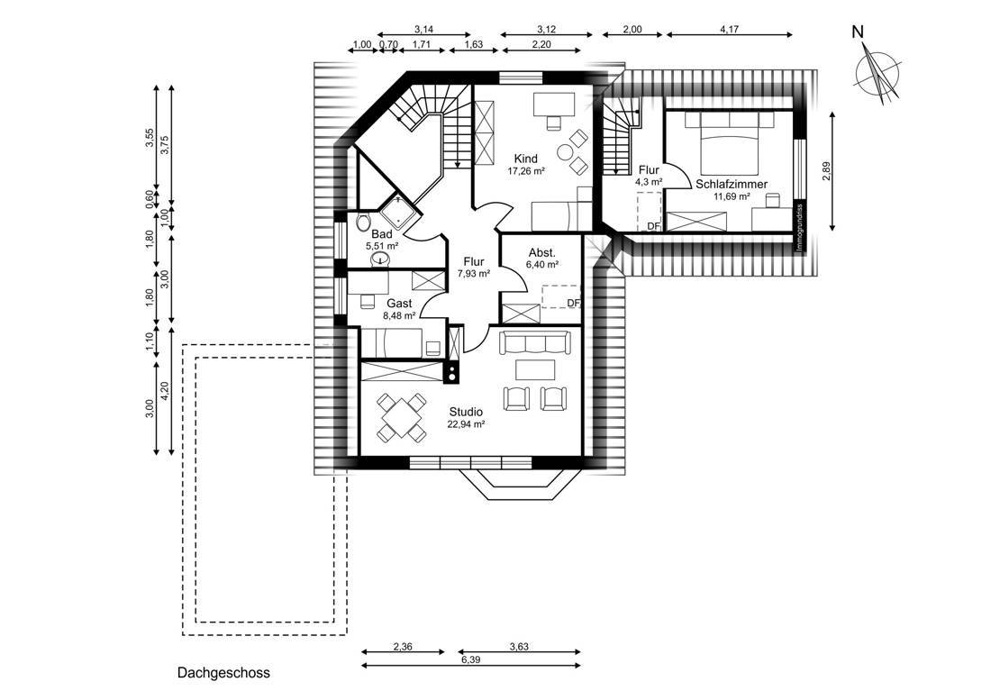 Im OG befinden sich drei weitere Zimmer, eine Küche (ohne Einbauten) und ein Bad.