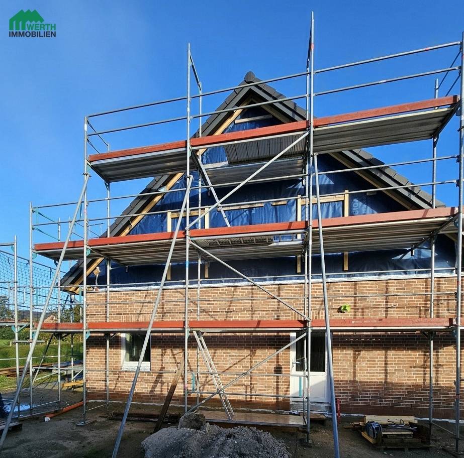 Stand Oktober 2025: Das Dach wird gerade gedeckt, innen trocknet der Putz. S. auch Exposé.