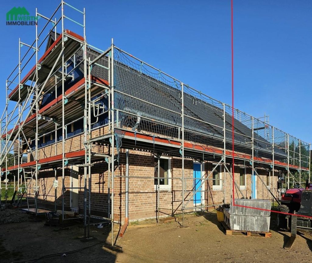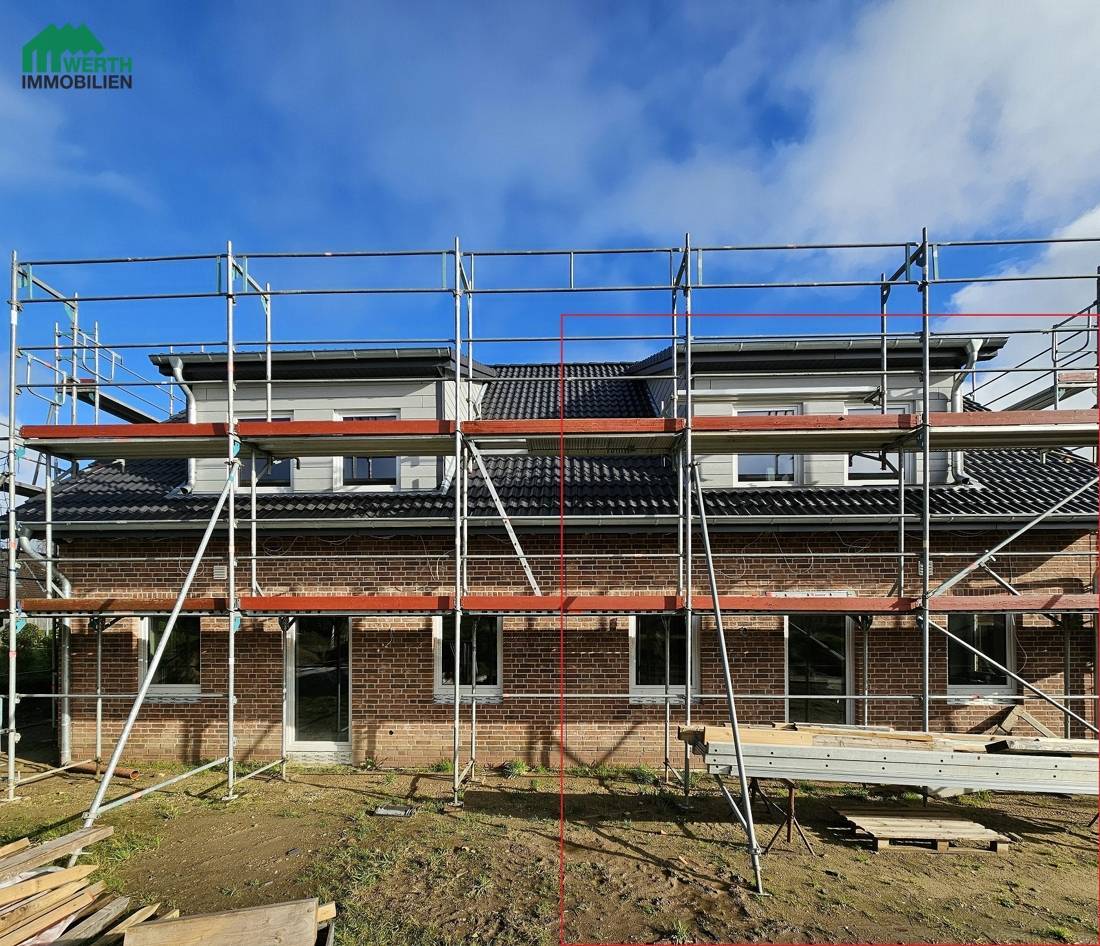 Die Baufertigstellung wird im Frühjahr 2026 erwartet. Praktisch: Die Doppelhaushälfte hat Ausgänge an drei Hausseiten.