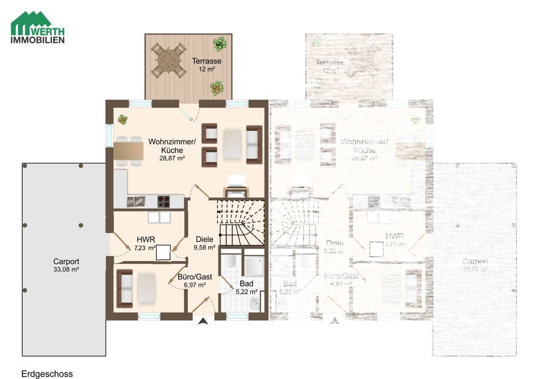 Grundstück: Klein und fein. Das Gesamtgrundstück für beide Haushälften umfasst ca. 737 m² und wird noch geteilt werden. Es erwarten Sie eine pflegeleichte Rasenfläche, zwei Carports mit Kieszufahrten und zwei Terrassen westlich am Haus. Jede Doppelhaushälfte hat Außentüren an drei Seiten.