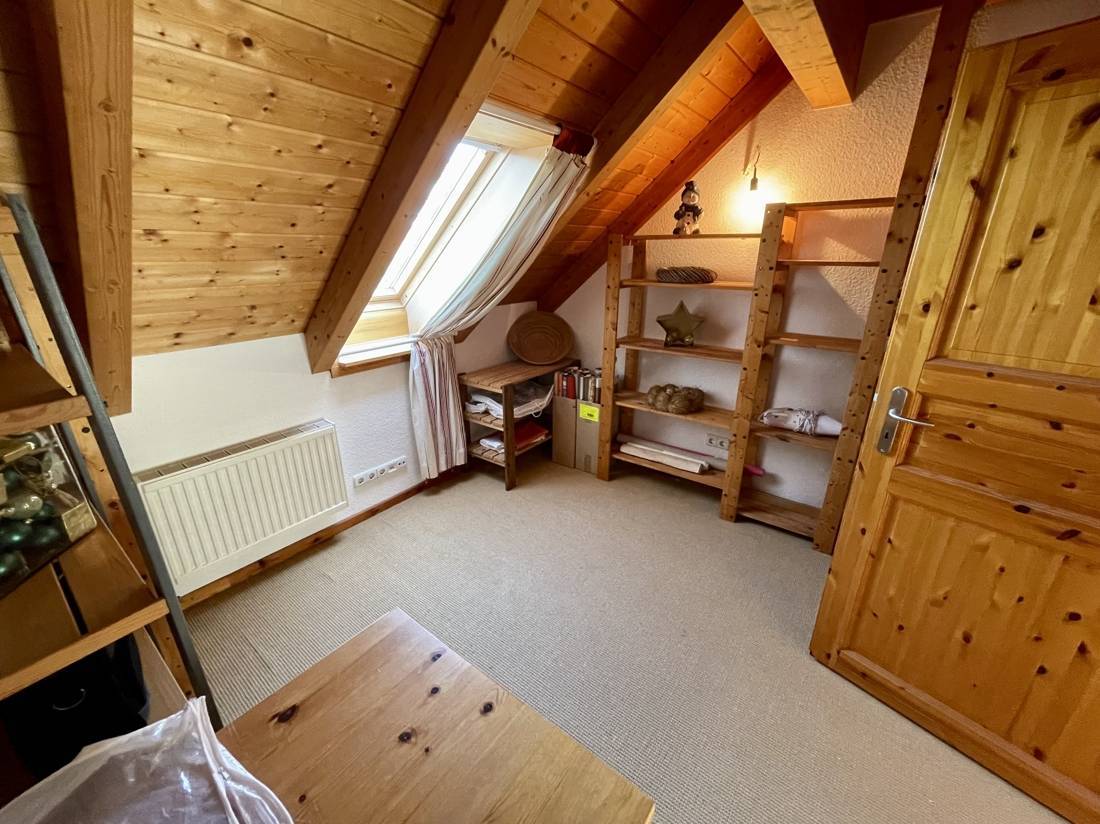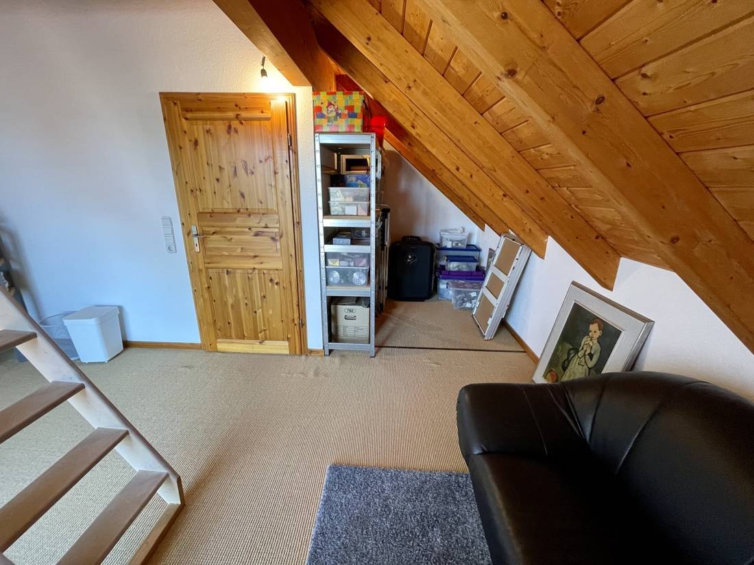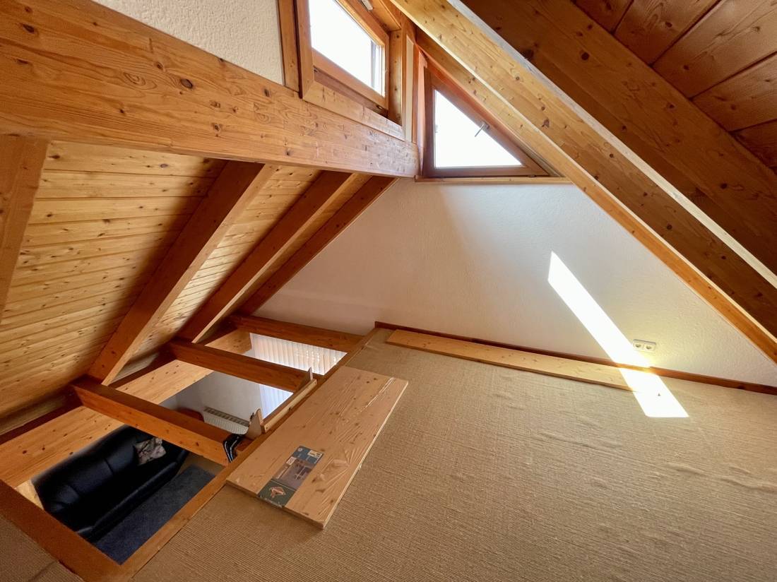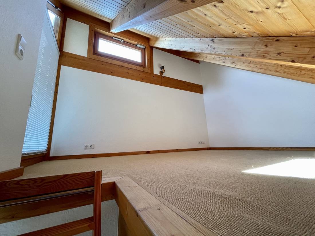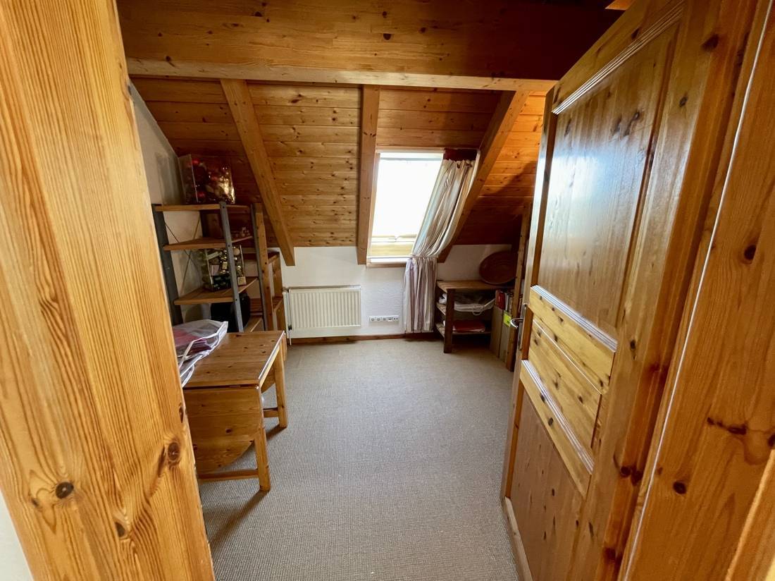 Zwei der Zimmer verfügen über zusätzliche, ausgebaute Räume, die über eine Innentreppe erreichbar sind. Die Spitzbodenfenster in diesen Zimmern lassen sich elektrisch öffnen. Der gesamte Fußboden im Obergeschoss, mit Ausnahme des Bads, ist mit einem Sisalteppich ausgelegt.