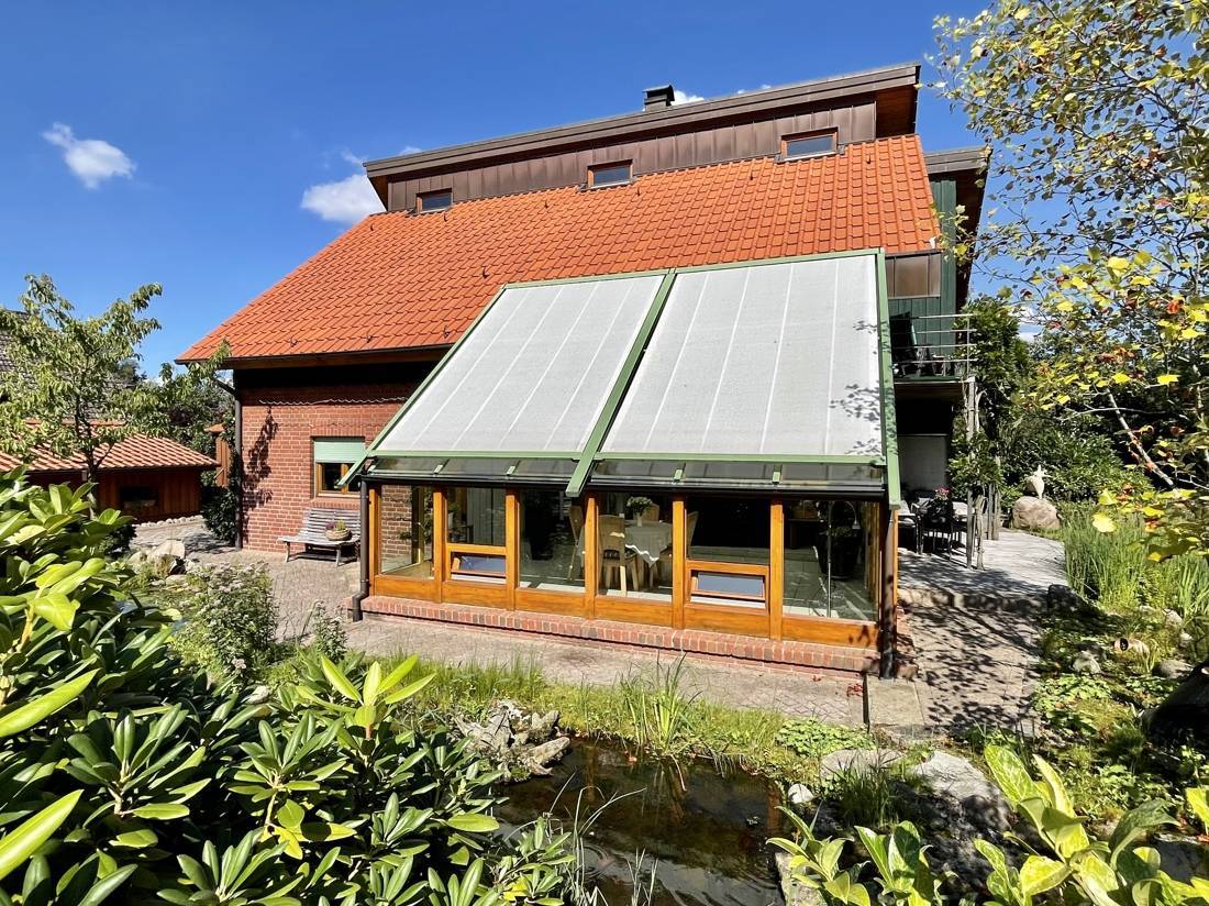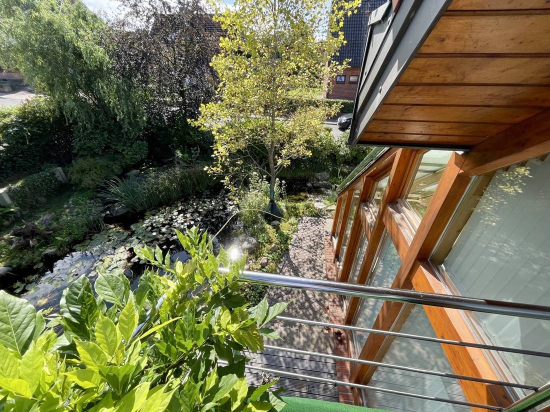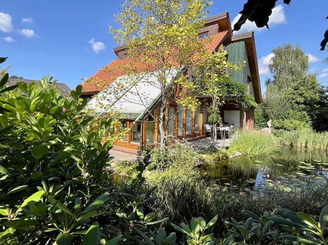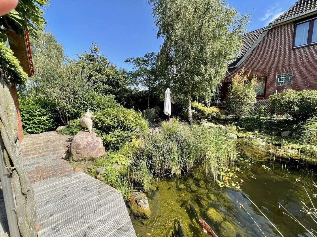 Vom Wohnzimmer und dem Wintergarten aus gelangen Sie auf drei Terrassen, die zum rund 719 qm großen Garten- und Teichgrundstück führen.