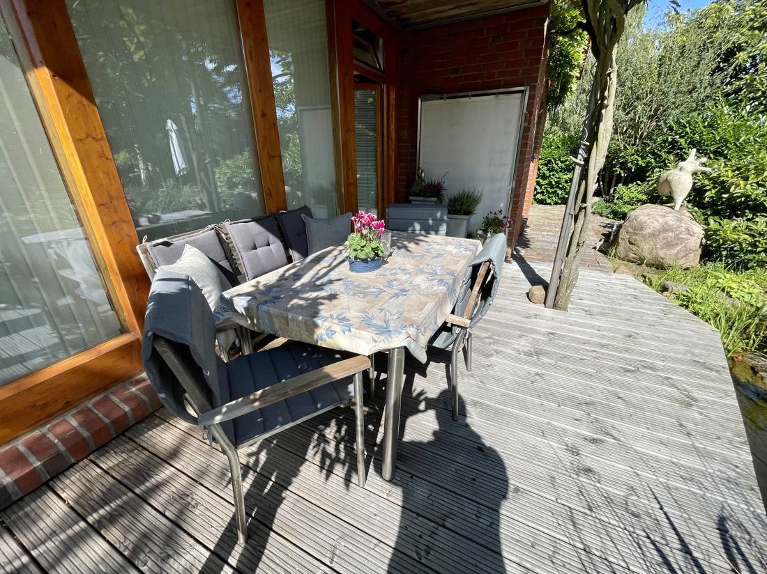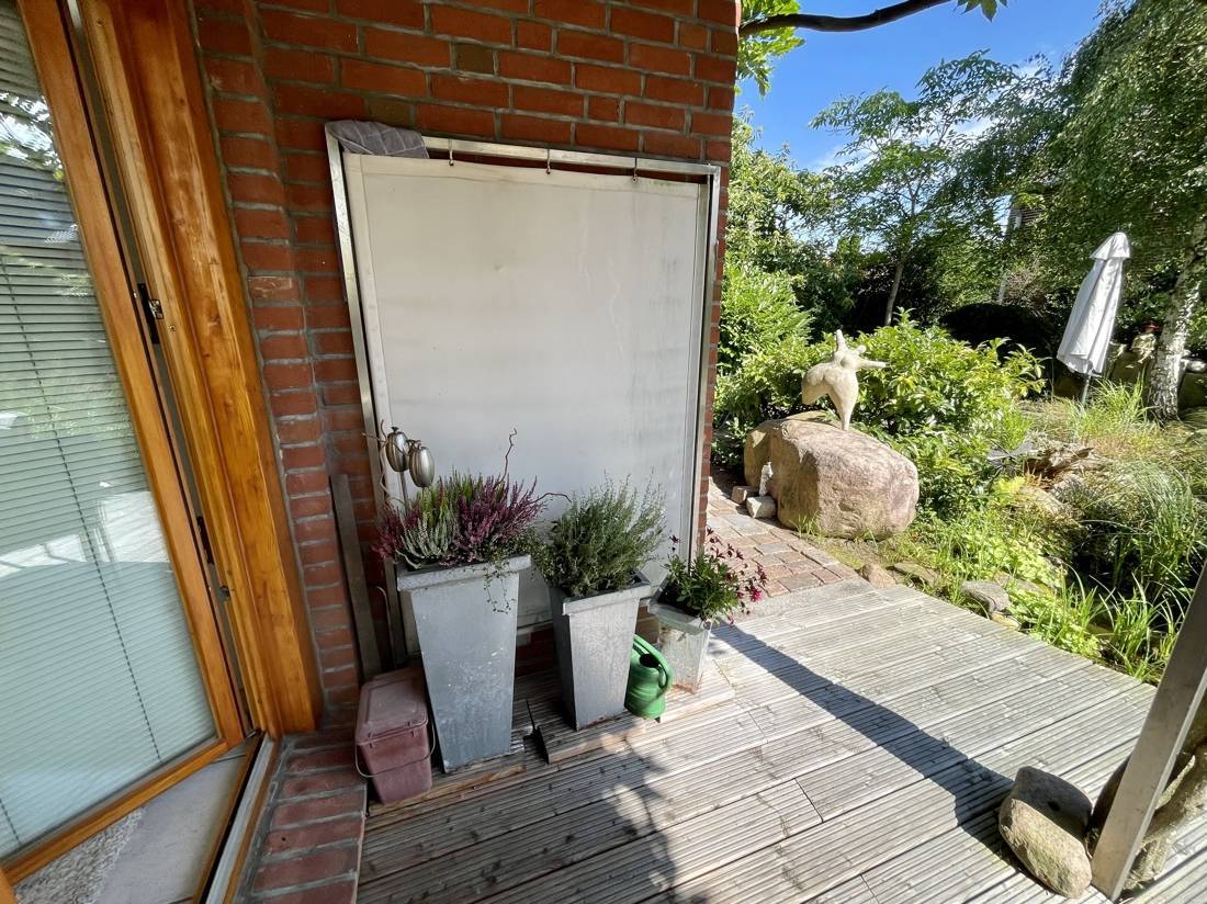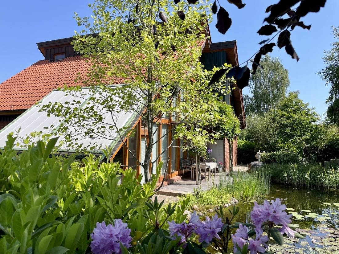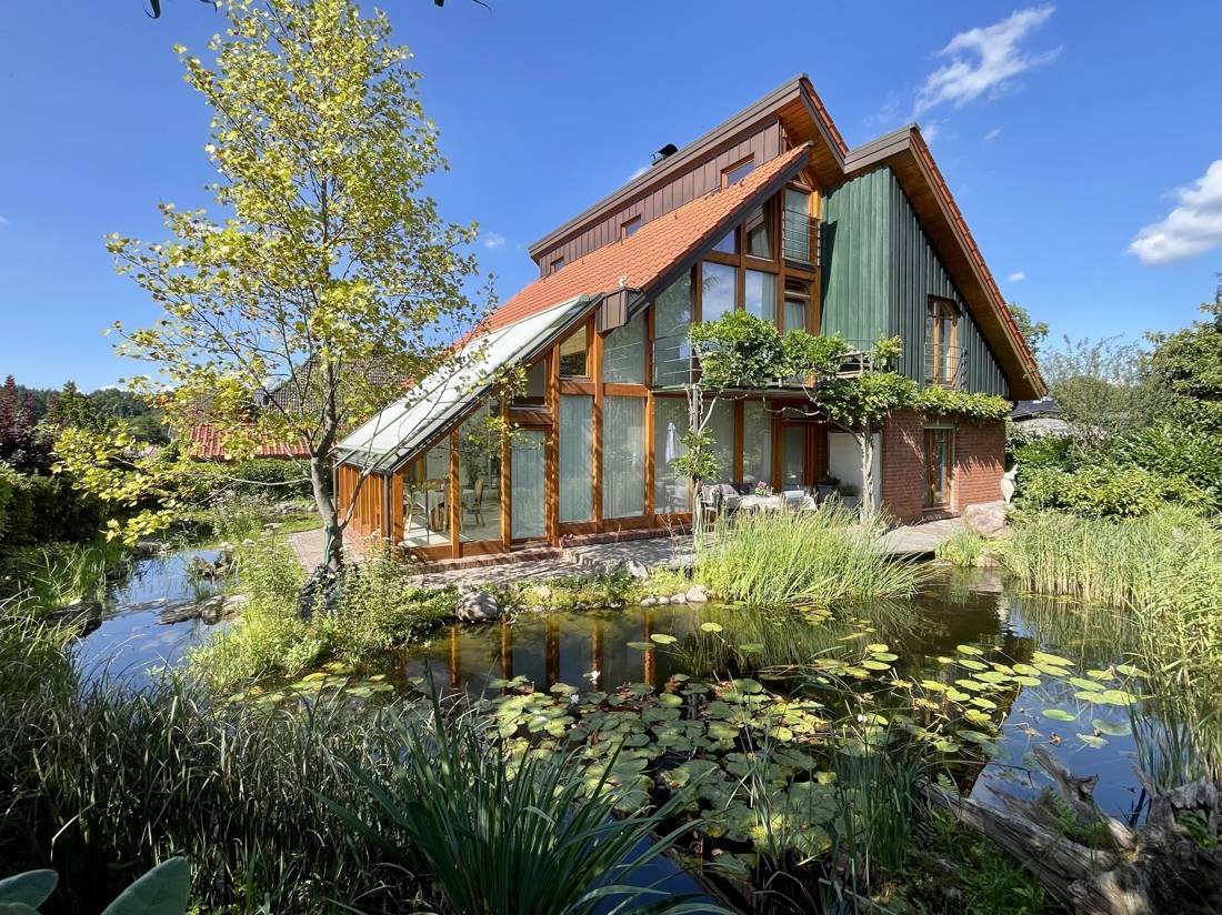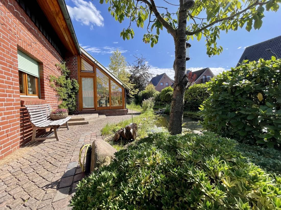 Vom Wohnzimmer und dem Wintergarten aus gelangen Sie auf drei Terrassen, die zum rund 719 qm großen Garten- und Teichgrundstück führen.