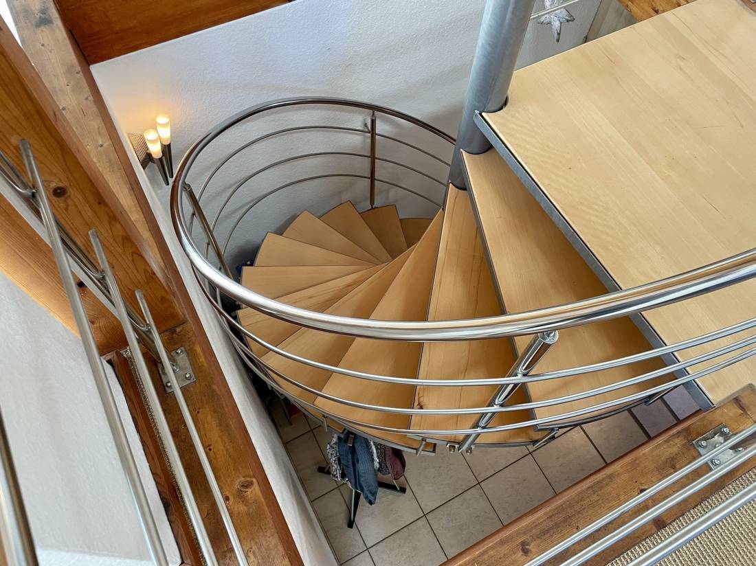 Beim Betreten des Hauses gelangen Sie in einen großzügigen Eingangsbereich und Flur, der mit einer eleganten Edelstahlwendeltreppe ins Obergeschoss führt. Alternativ können Sie das Haus auch durch die Nebeneingangstür über den Hauswirtschaftsraum (HWR) betreten.