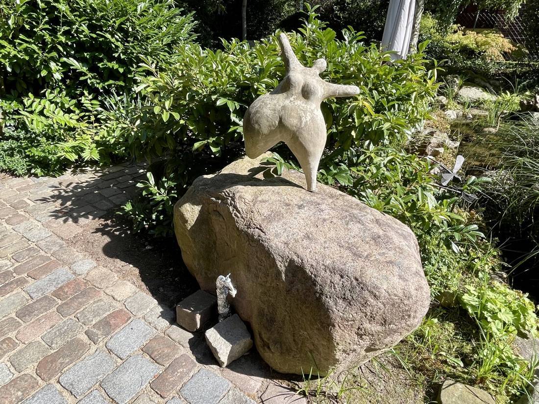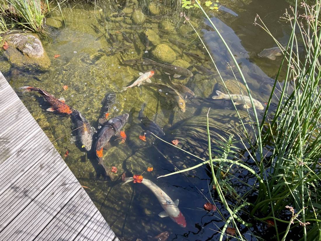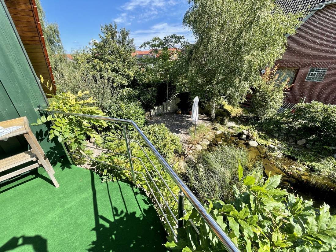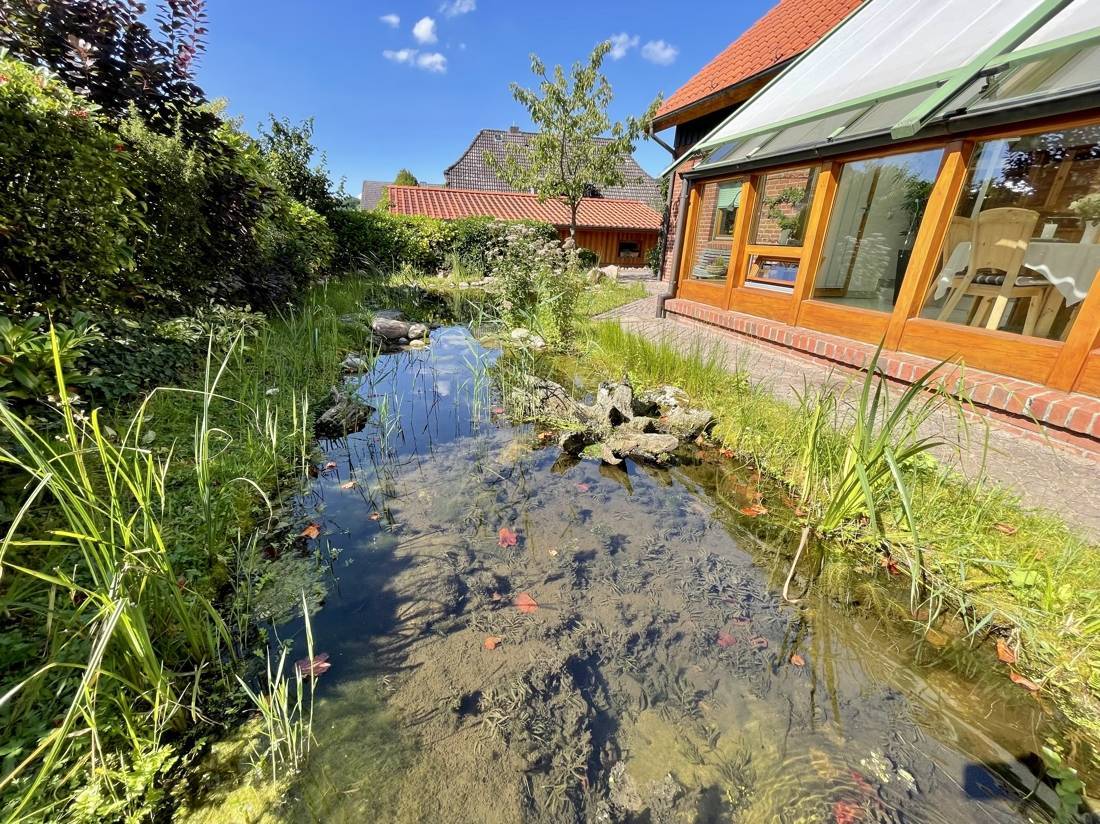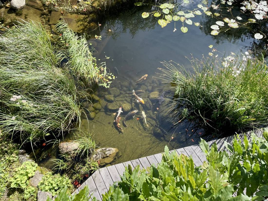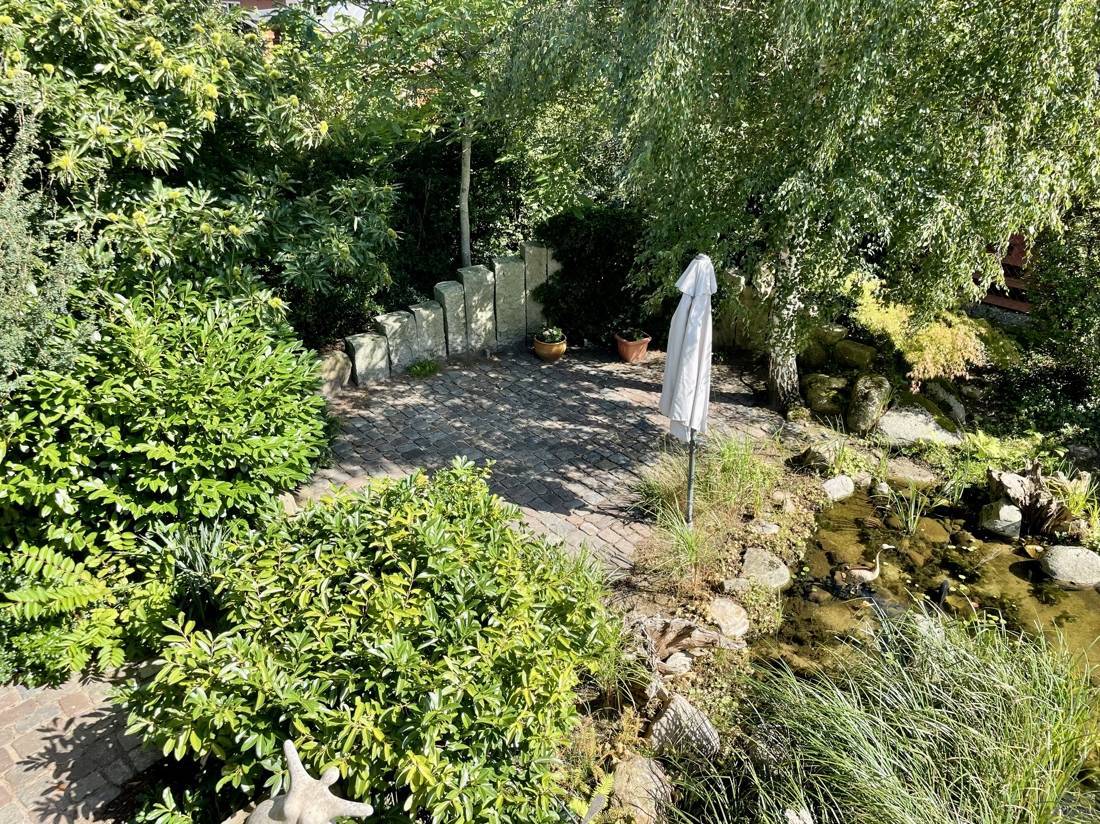 Ein Highlight des Hauses ist der geschmackvoll angelegte Garten. Er verfügt über einen beeindruckenden Koiteich und zwei Wasserläufe, die eine entspannende Atmosphäre schaffen und zum Verweilen einladen.