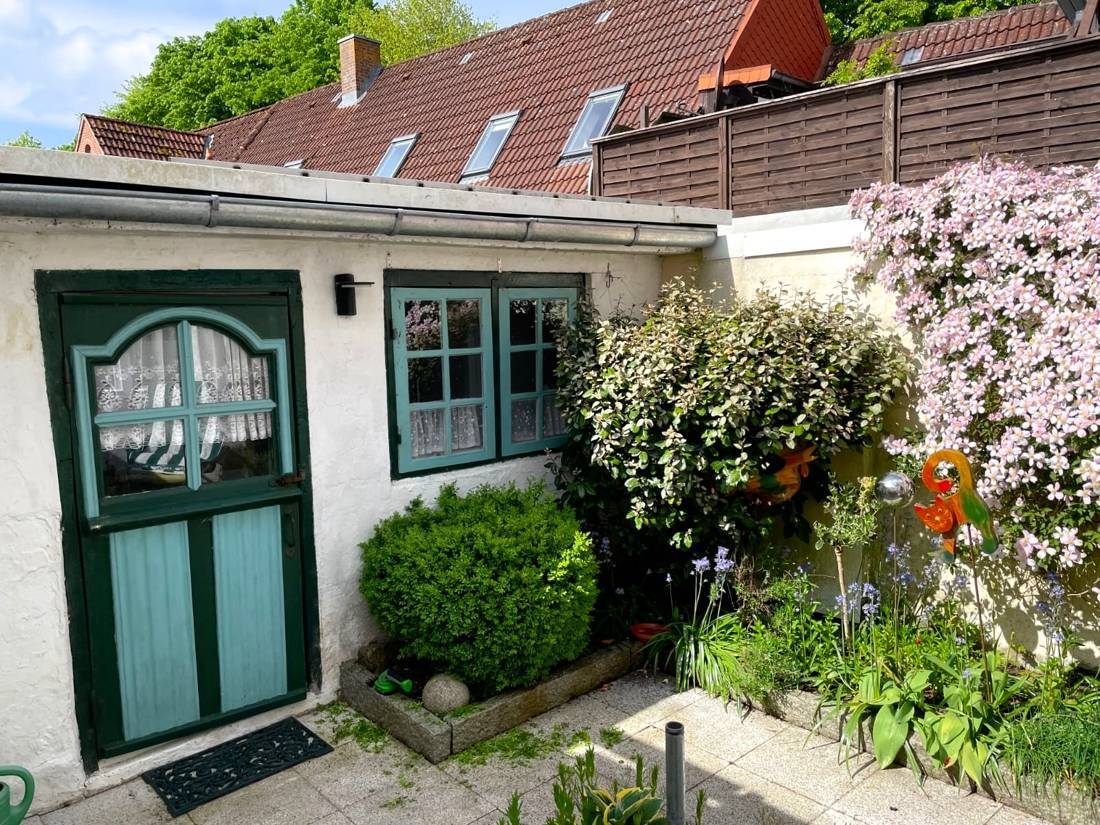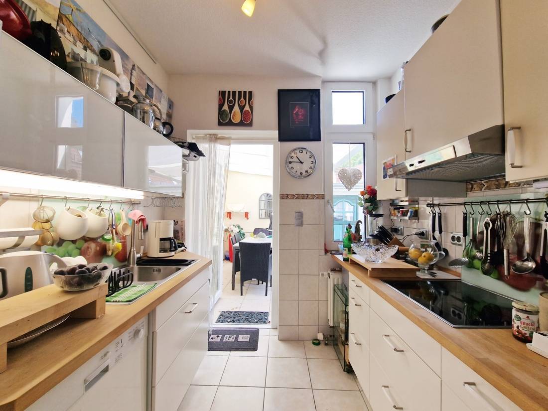Ein echtes Plus ist der direkte Zugang von der Küche in den geschützten Hinterhof mit beschatteter Terrasse – perfekt für den ersten Kaffee am Morgen oder den Sommerabend zu zweit. Zum Ensemble gehört außerdem ein Nebengebäude (ehemaliger Stall, ca. 16 m²) mit Hauswirtschaftsraum und zusätzlichem Stauraum. Die Gasheizung (2017) sorgt effizient für Wärme.