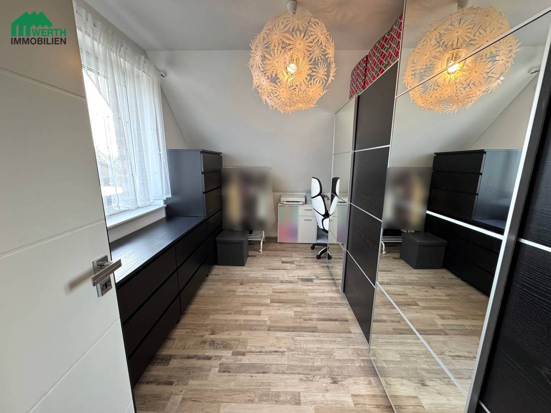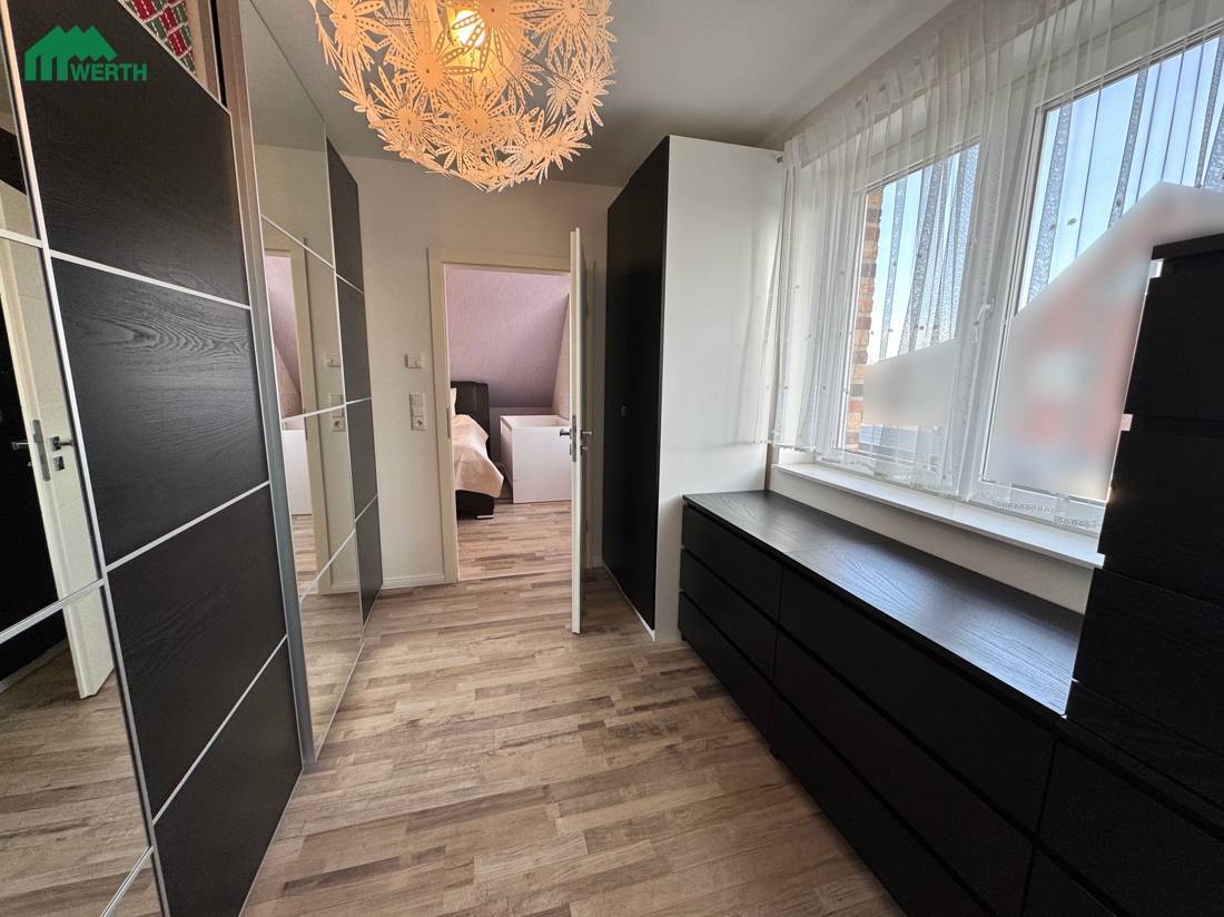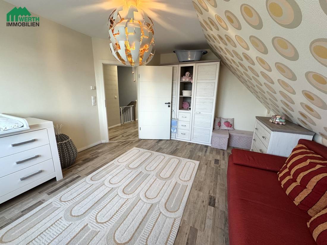 Im Dachgeschoss befinden sich das Elternschlafzimmer, zwei Kinderzimmer sowie eine separate Ankleide, die derzeit direkt über das Schlafzimmer zugänglich ist. Mit einer überschaubaren Umbaumaßnahme kann die Ankleide alternativ über den Flur erschlossen werden. Dadurch ließe sich im Dachgeschoss ein zusätzliches, vollwertiges Zimmer realisieren – ideal als Homeoffice, Gästezimmer oder weiterer Rückzugsraum. Diese flexible Gestaltungsmöglichkeit macht das Haus besonders zukunftsfähig und anpassbar an unterschiedliche Lebensphasen.