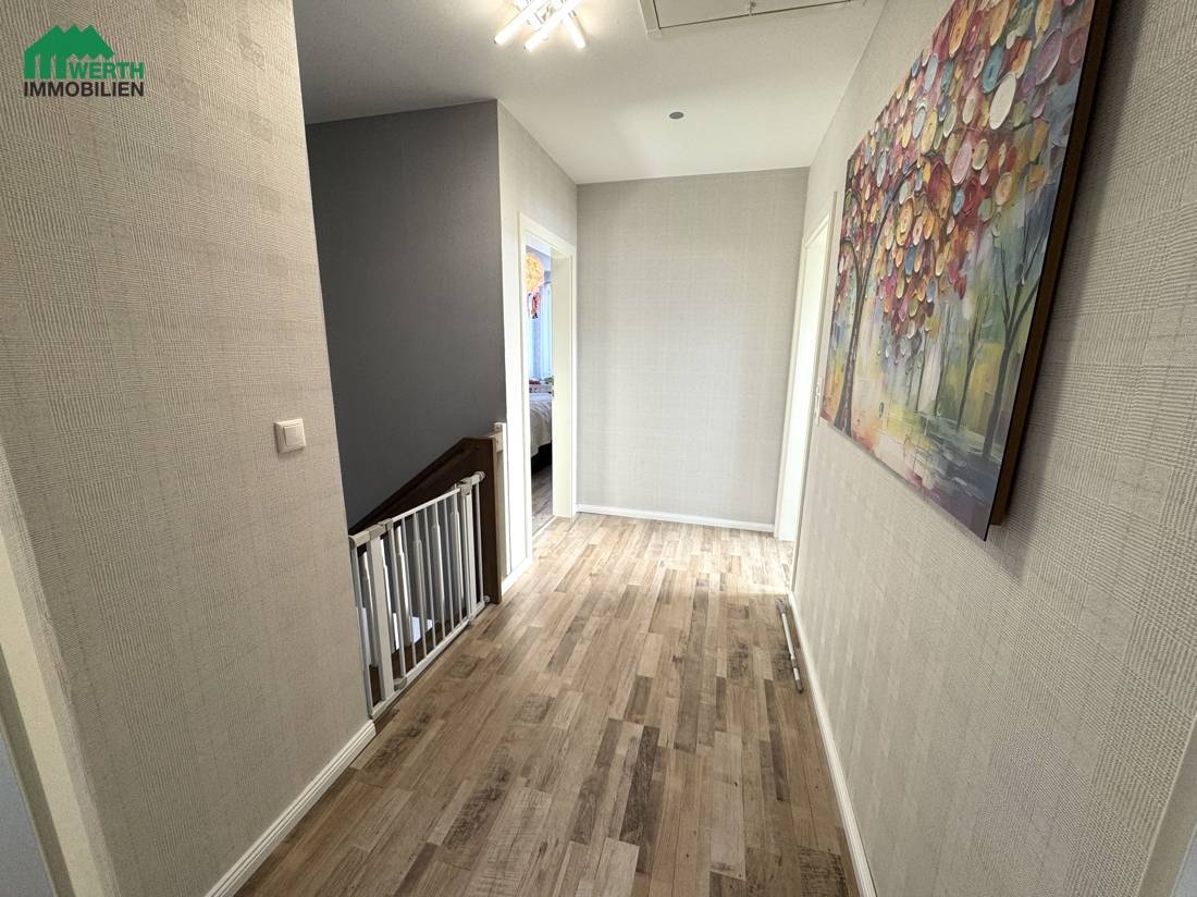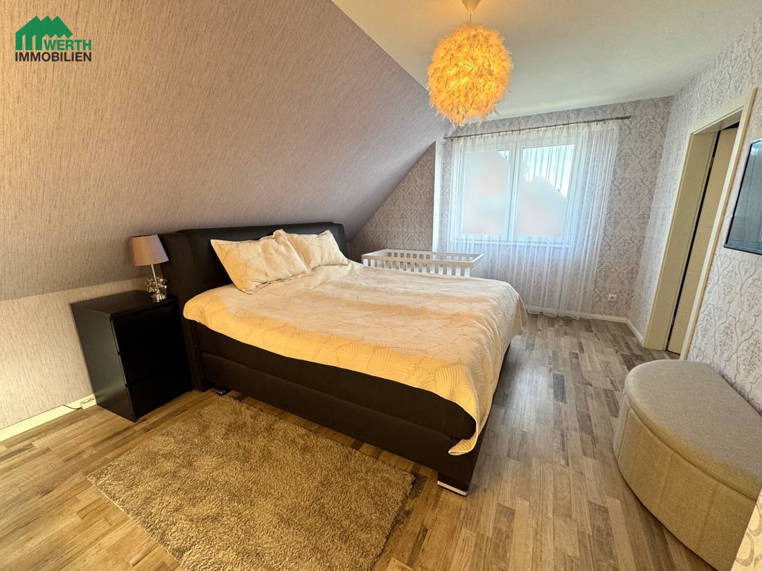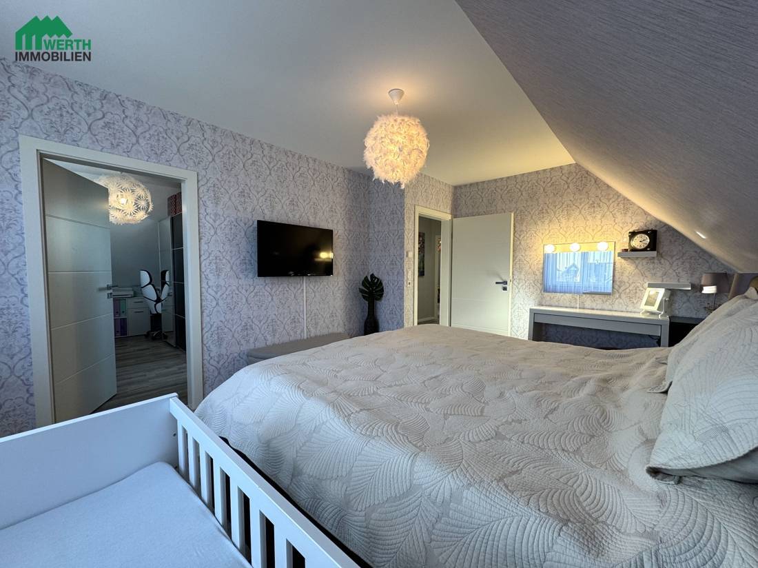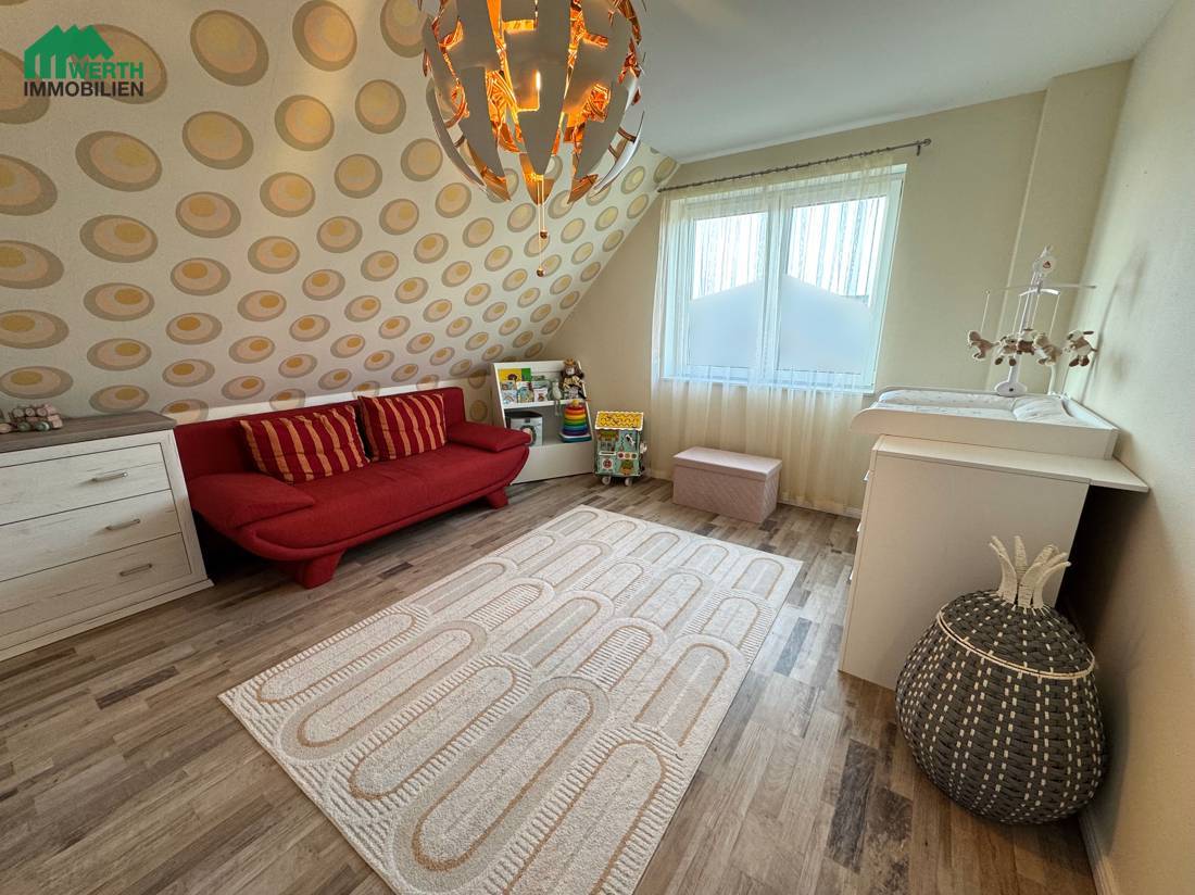 Im Dachgeschoss befinden sich das Elternschlafzimmer, zwei Kinderzimmer sowie eine separate Ankleide, die derzeit direkt über das Schlafzimmer zugänglich ist. Mit einer überschaubaren Umbaumaßnahme kann die Ankleide alternativ über den Flur erschlossen werden. Dadurch ließe sich im Dachgeschoss ein zusätzliches, vollwertiges Zimmer realisieren – ideal als Homeoffice, Gästezimmer oder weiterer Rückzugsraum. Diese flexible Gestaltungsmöglichkeit macht das Haus besonders zukunftsfähig und anpassbar an unterschiedliche Lebensphasen.
