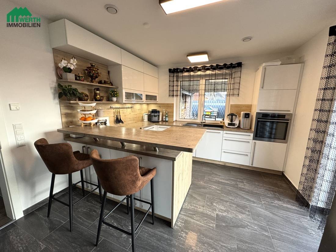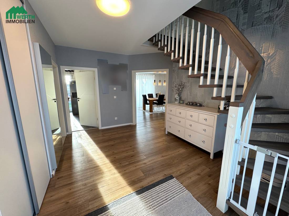 Bereits beim Betreten des Hauses wird das angenehme Raumgefühl deutlich: Die Deckenhöhe von 2,59 m im Erdgeschoss sorgt in Verbindung mit großen Fensterflächen für ein offenes, lichtdurchflutetes Wohnambiente. Der Wohn- und Essbereich bildet das Herzstück des Hauses und bietet direkten Zugang zur sonnigen Terrasse und in den Garten. Eine elegante Glasschiebetür verbindet die Küche mit dem Wohnzimmer und ermöglicht ein flexibles Zusammenspiel aus Offenheit und Rückzug.