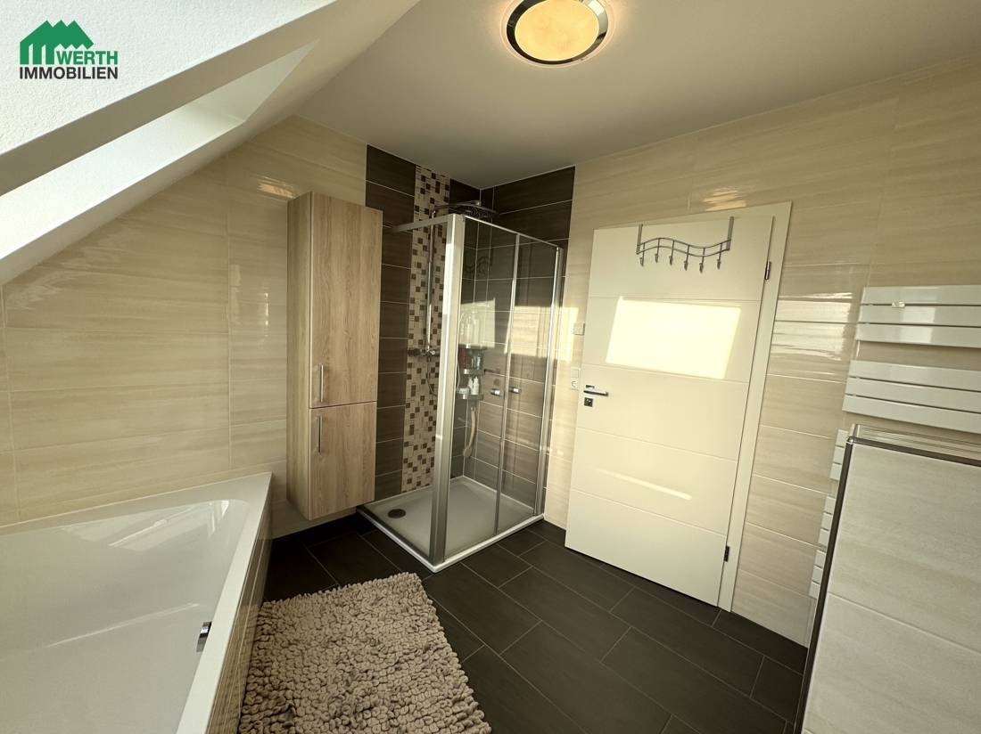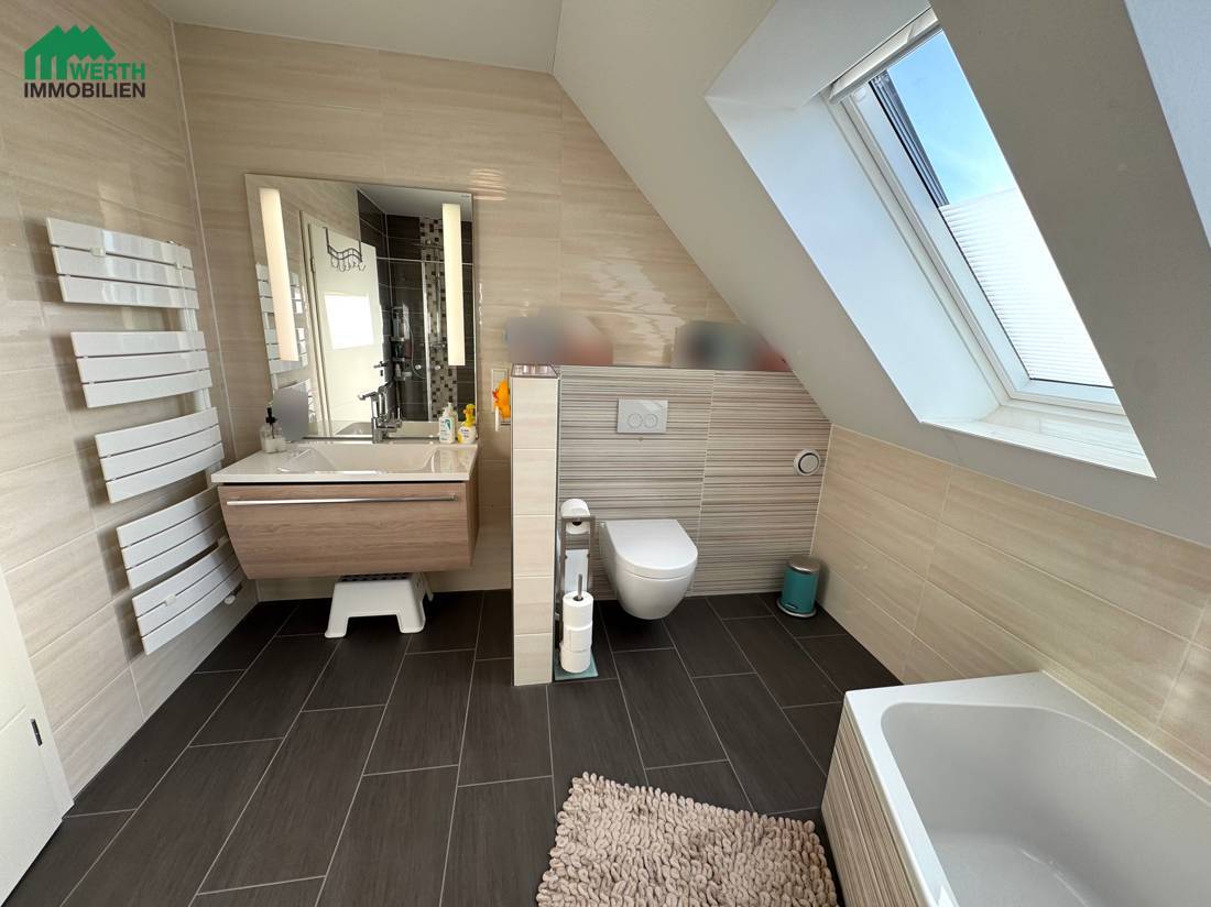 Das großzügige Familienbad mit Dusche, Badewanne und zwei Veluxfenstern mit elektrischen Außenrollläden bietet Komfort für den Familienalltag. Ergänzt wird das Raumangebot durch ein modernes Dusch-WC im Erdgeschoss.