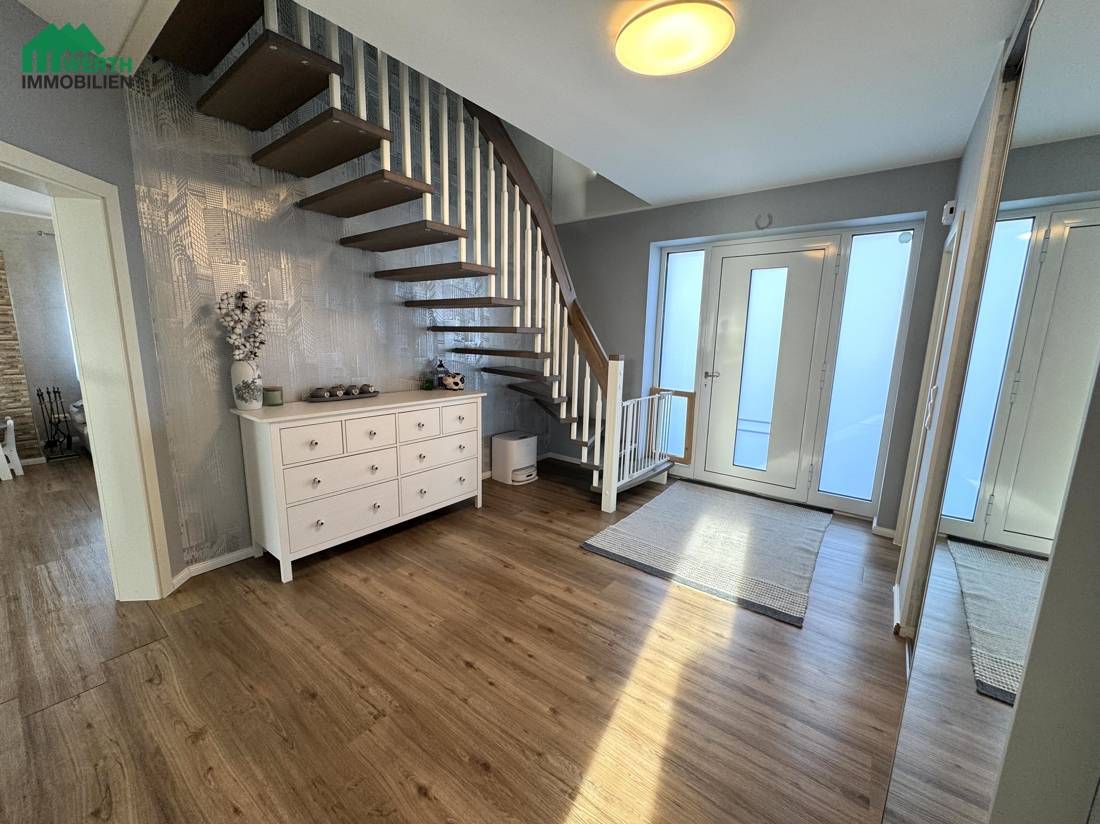 Die Bodenbeläge sind geschmackvoll und alltagstauglich gewählt: Im Erdgeschoss wurden Fliesen und hochwertiges Klickvinyl verlegt, während im Dachgeschoss Laminat in den Wohnräumen und Fliesen im Badezimmer für ein stimmiges Gesamtbild sorgen. Auch hier unterstreicht die Deckenhöhe von 2,50 m das großzügige Raumgefühl.