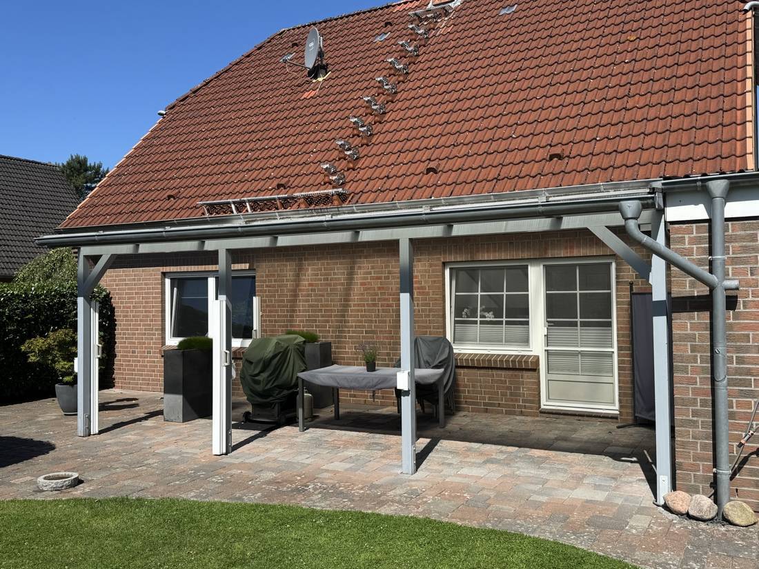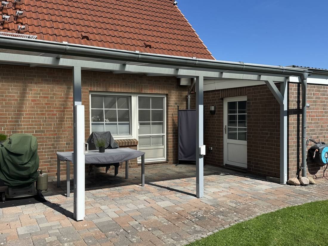 Hier finden Sie eine überdachte Terrasse mit Windschutz und ein schönes Gartenhaus.