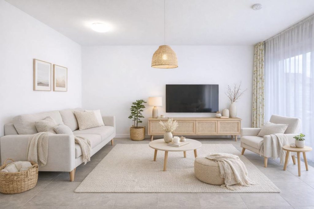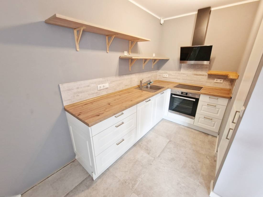 Die Wohnung verfügt über einen Wohn- und Essbereich, eine offene Küche, ein Schlafzimmer, einen Eingangsbereich mit Einbauschränken und ein modernes Duschbad mit Fußbodenheizung.