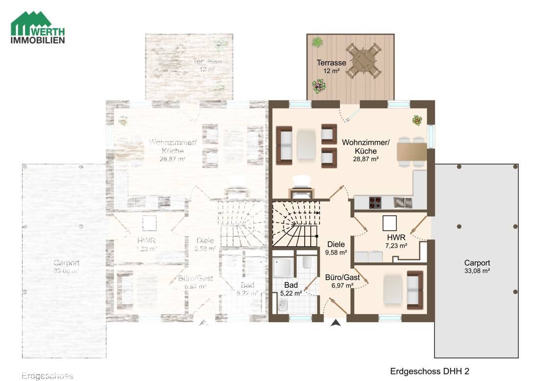 Grundstück: Klein und fein. Das Gesamtgrundstück für beide Haushälften umfasst ca. 737 m² und wird noch geteilt werden. Es erwarten Sie eine pflegeleichte Rasenfläche, ein Carport mit Kieszufahrt und eine Terrasse westlich am Haus.