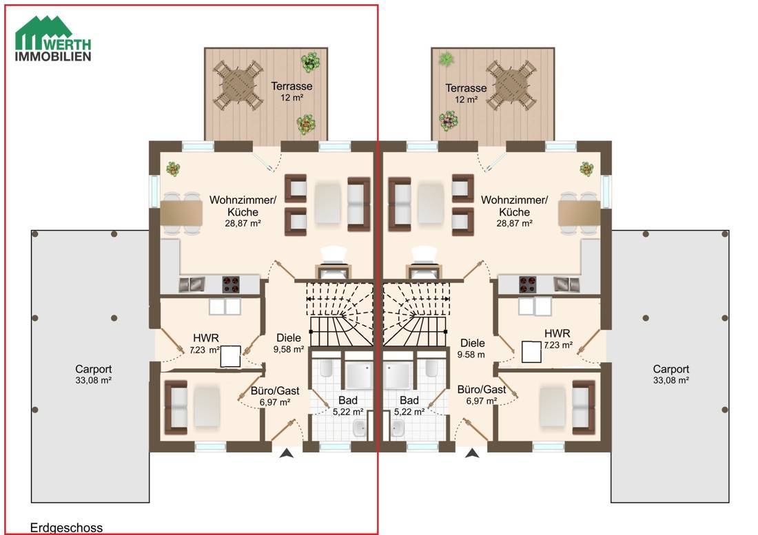Grundstück: Klein und fein. Das Gesamtgrundstück für beide Haushälften umfasst ca. 737 m² und wird noch geteilt werden. Es erwarten Sie eine pflegeleichte Rasenfläche, zwei Carports mit Kieszufahrten und zwei Terrassen westlich am Haus. Jede Doppelhaushälfte hat Außentüren an drei Seiten.
