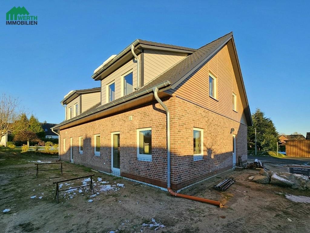 Die Baufertigstellung wird im Frühjahr 2026 erwartet. Praktisch: Die Doppelhaushälfte hat Ausgänge an drei Hausseiten.