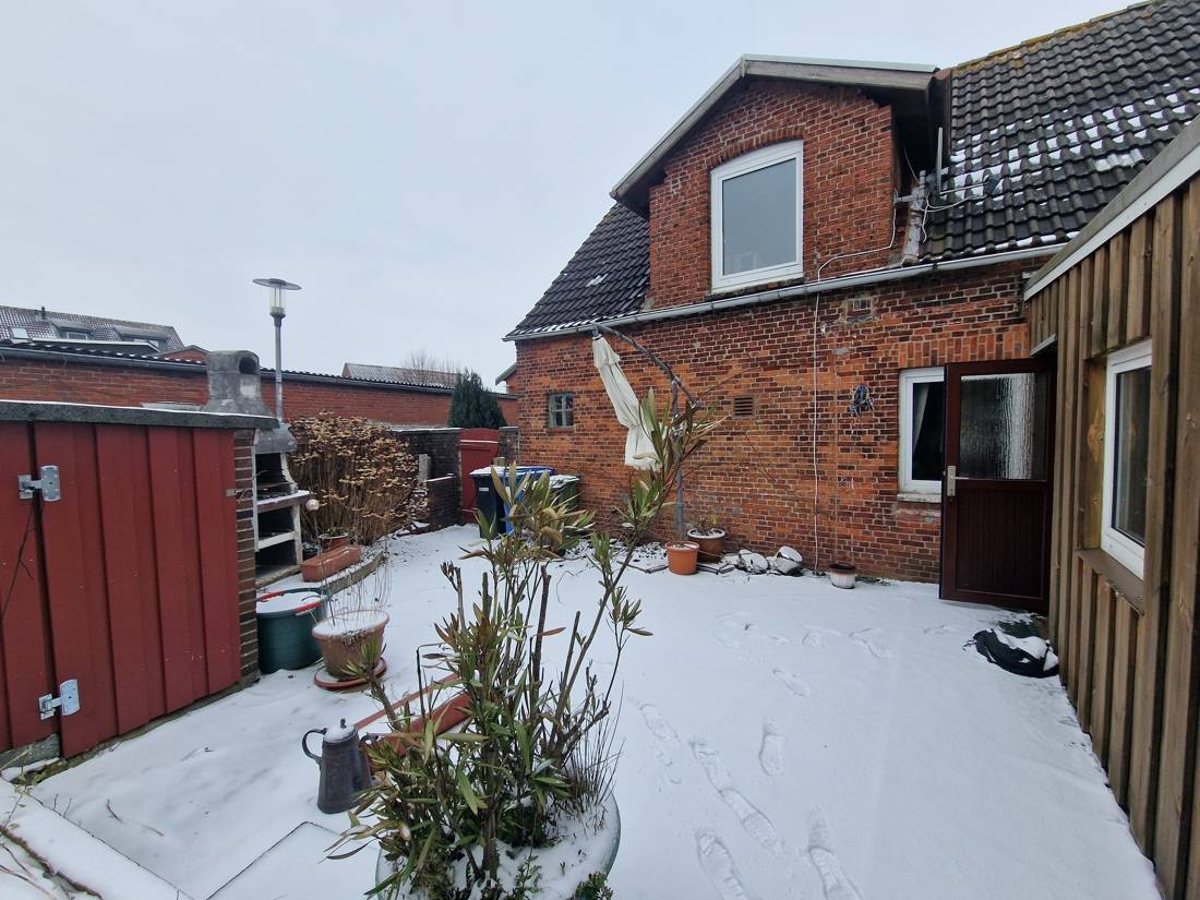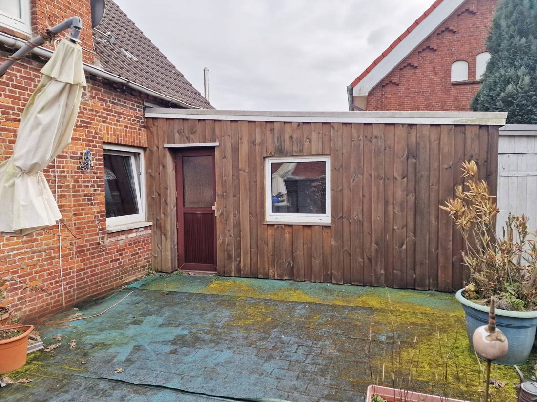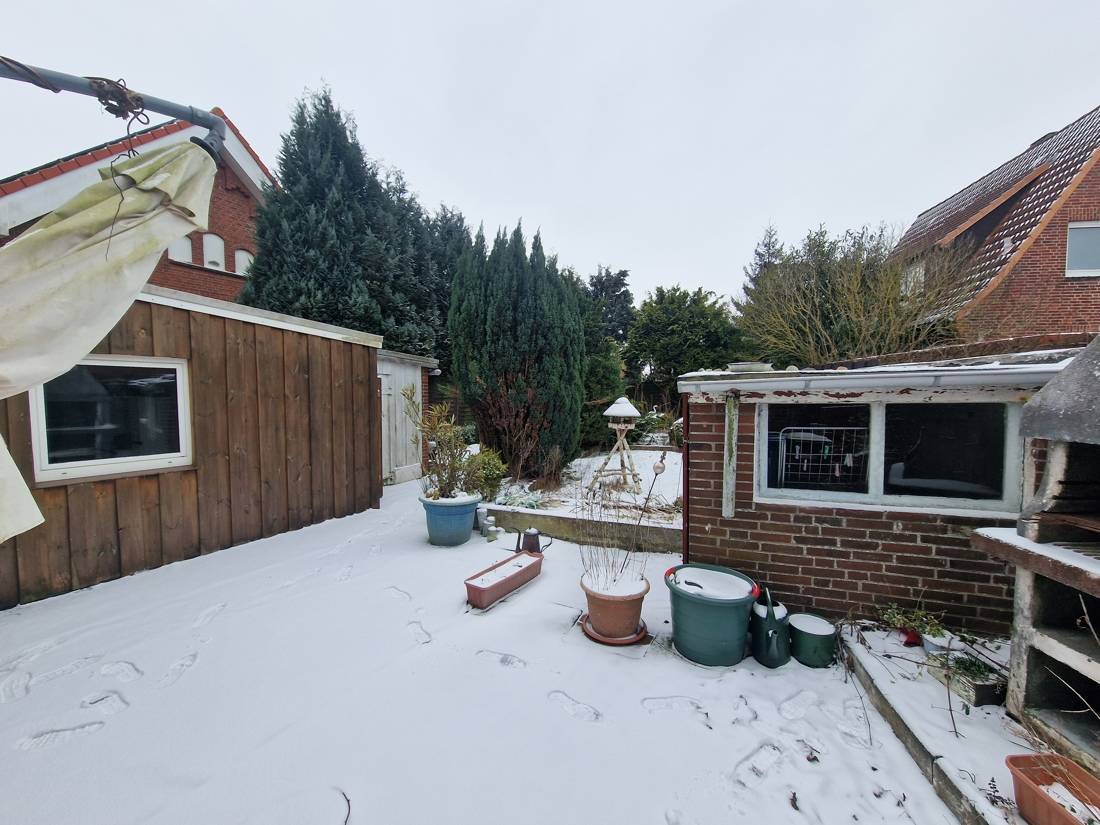 Ein funktionaler Flachdachanbau erweitert die Immobilie sinnvoll: Hier befinden sich ein Flur, das Wannenbad sowie die im Jahr 2022 erneuerte Gasheizung. Vom Flur aus gelangen Sie direkt auf die Terrasse, die sich ideal für entspannte Stunden im Freien eignet.
