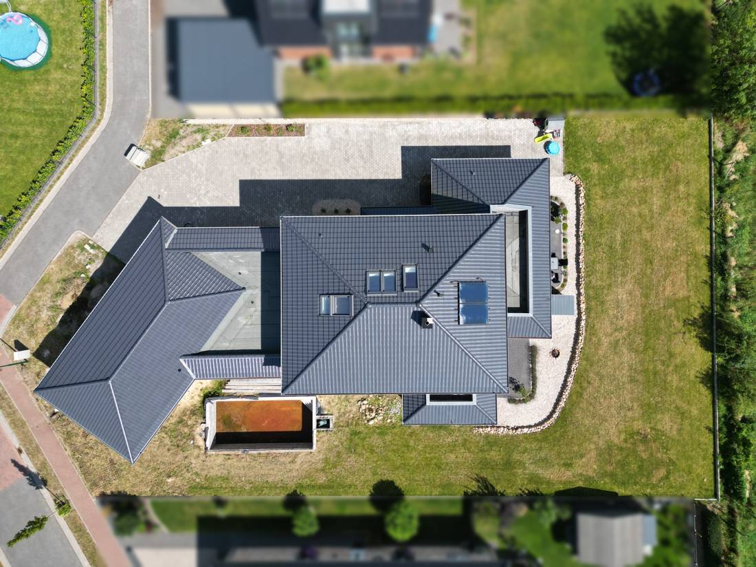 Auch der Außenbereich überzeugt: eine Sonnenterrasse, zwei Dachterrassen mit unverbaubarem Blick ins Grüne sowie ein überdachter Bereich zwischen Haupthaus und Anbau, der sich als zusätzliche Terrasse nutzen lässt. Der hintere Garten ist bereits angelegt, der vordere Teil noch frei gestaltbar. Ein Pool im Rohbau wartet darauf, von den neuen Eigentümern vollendet zu werden.
