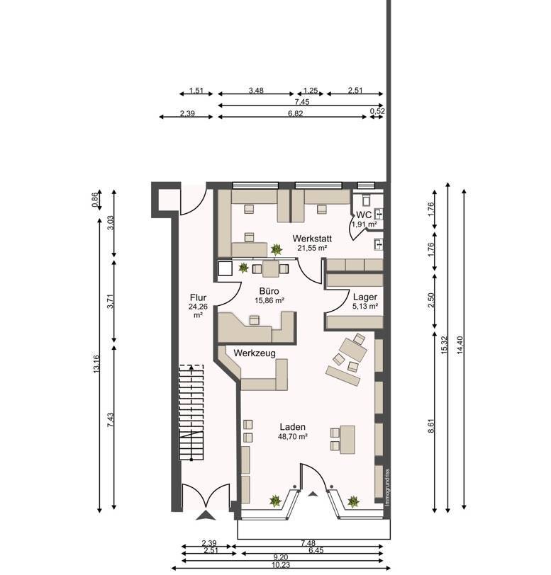 Auf einer Grundstücksfläche von ca. 340 m² bietet das Objekt im Erdgeschoss eine 110 m² große Ladenfläche, die von der zentralen Lage profitiert. Die Verkaufsfläche eröffnet vielfältige Nutzungsmöglichkeiten und lädt dazu ein, kreative Geschäftsideen zu verwirklichen.