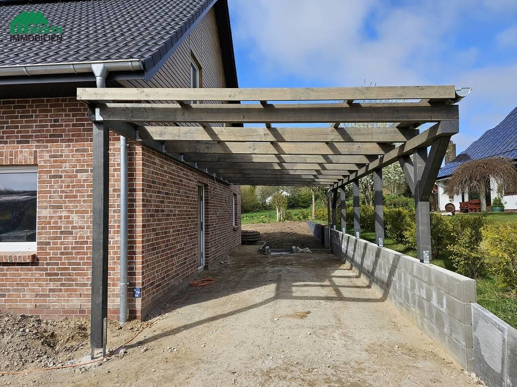 Bauphase: Jetzt steht schon der erste von beiden Carports und die Terrassen werden gerade angelegt.