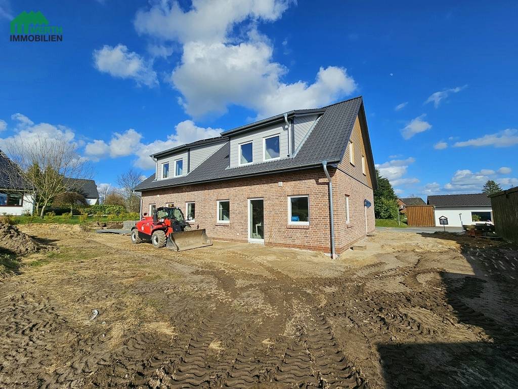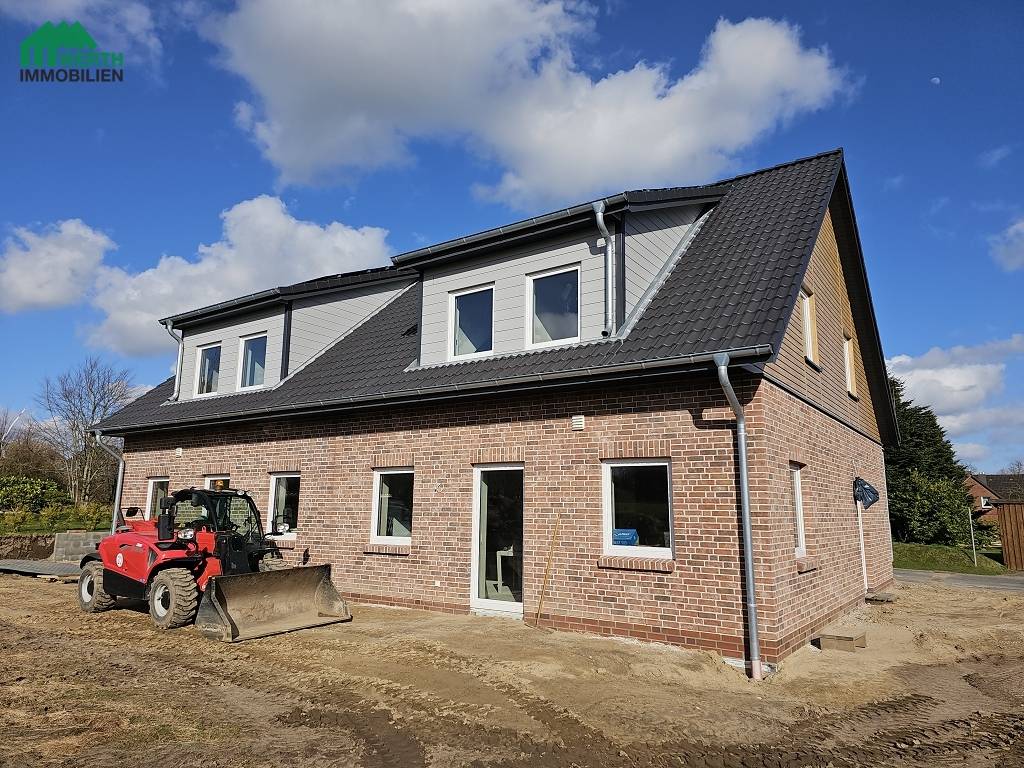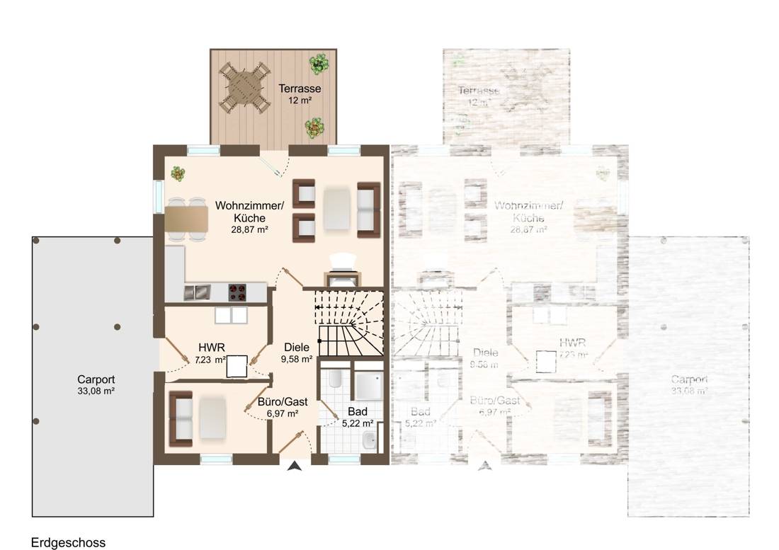 Grundstück: Klein und fein. Das Gesamtgrundstück für beide Haushälften umfasst ca. 737 m² und wird noch geteilt werden. Es erwarten Sie eine pflegeleichte Rasenfläche, zwei Carports mit Kieszufahrten und zwei Terrassen westlich am Haus. Jede Doppelhaushälfte hat Außentüren an drei Seiten.