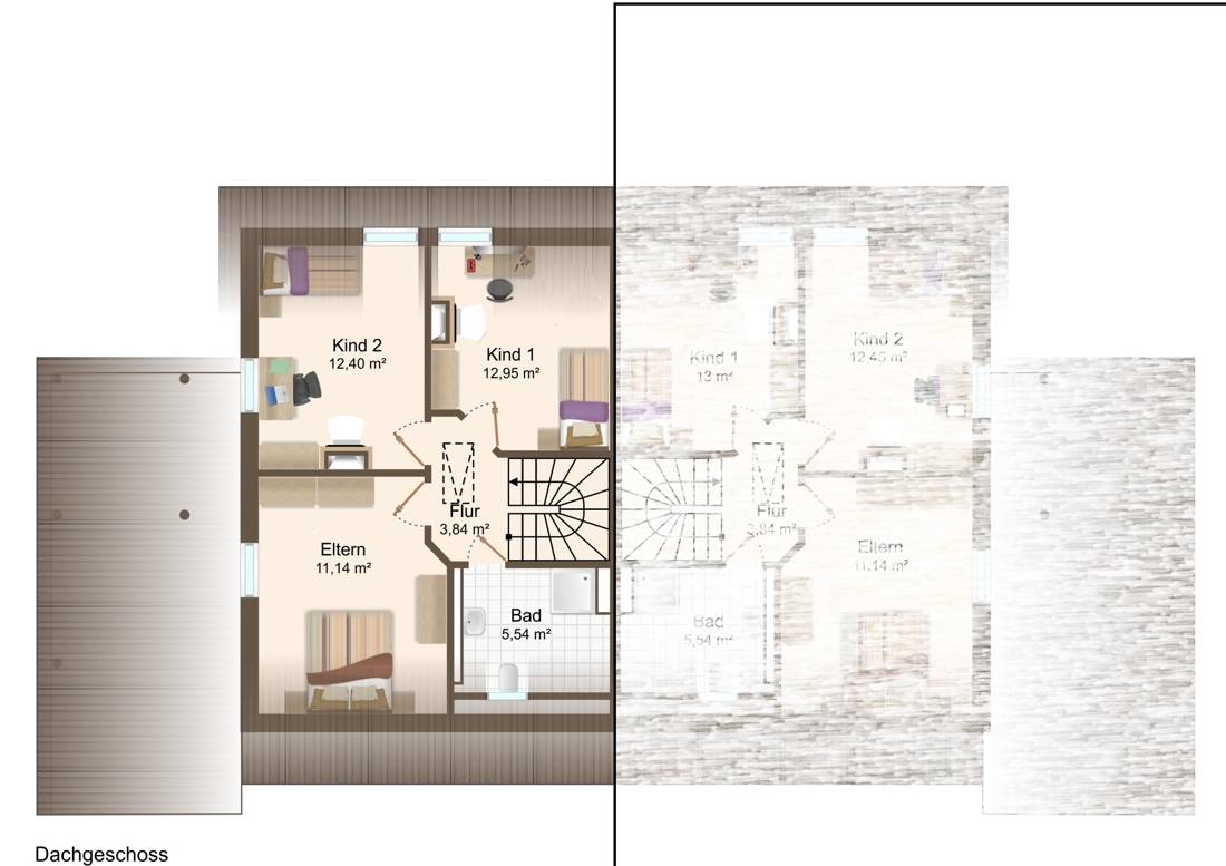 Sie erwerben ein massiv gebautes Haus (KfW 40!) Gaube im Dachgeschoss. (Eine Gaube ist ein Fensteraufbau im Schrägdach, welcher Licht, Luft und Platz schafft. Vorteil: Man kann gerade stehen unter der Gaube und hat ungestörten Weitblick nach draußen durch das senkrechte Fenster). Dach: Betondachpfannen.