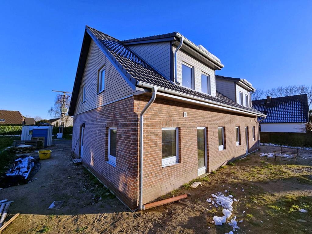 Neubau Doppelhaus nach KfW-40-Standard. Praktisch: Sie können Ihr Haus von drei Seiten betreten.
