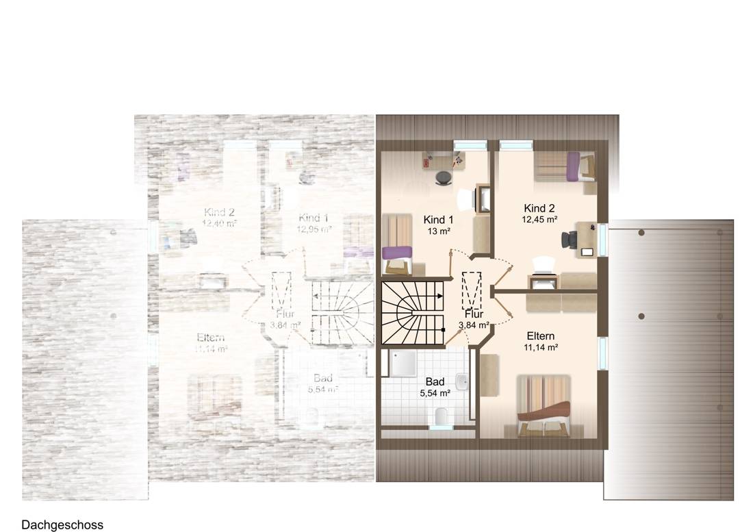 Außenwände: insgesamt 47 cm Durchmesser mit u. a. 16 cm Kerndämmung. Außenfarbe: Rot-bunte Vormauerziegel. Giebelbereich und Gauben außen: Kunststoff. Keine Sorge: In diesem Bereich wurde extra gedämmt – gegen die Wärme oder Kälte – und gleichzeitig gegen den Schall. Fenster: Kunststoffrahmen mit Dreifachverglasung.