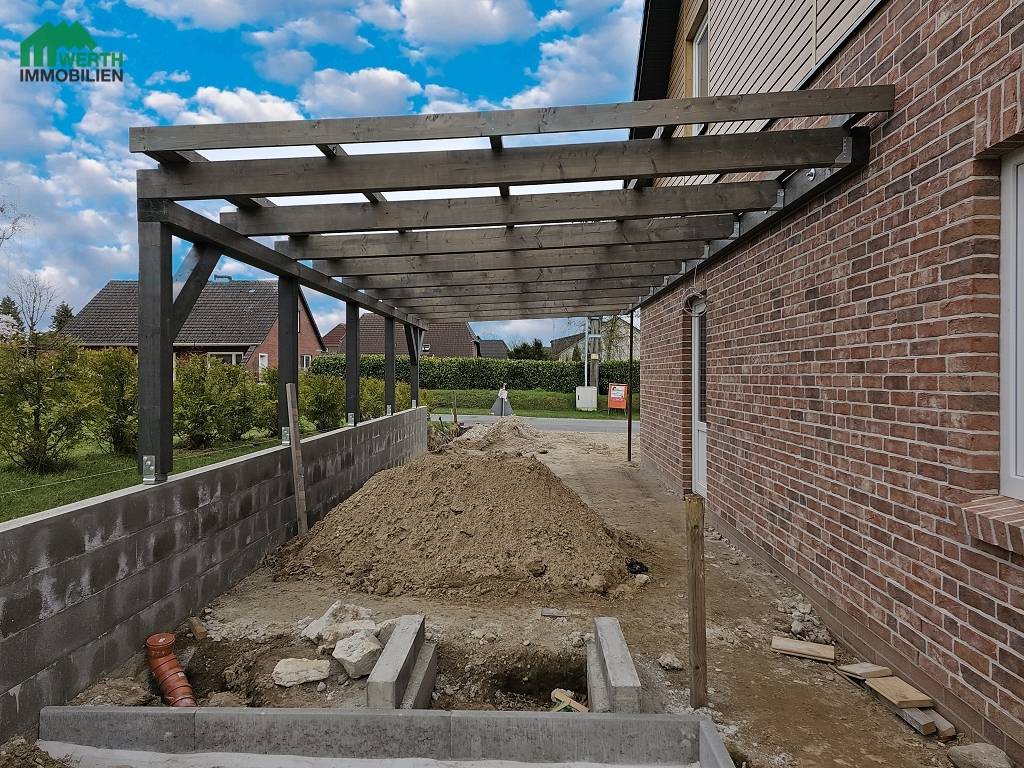 Bauphase: Jetzt steht schon der erste von beiden Carports und die Terrassen werden gerade angelegt.