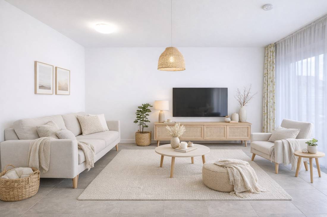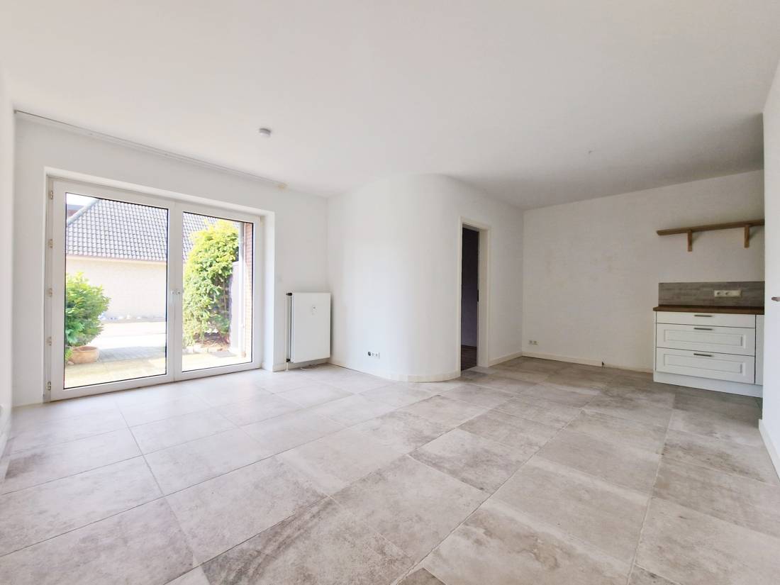 Vom Wohn- und Esszimmer aus gelangt man direkt auf die eigene Terrasse. Durch die großen Fensterelemente fällt genügend Tageslicht in die Wohnung, was ein schönes Wohnklima schafft.