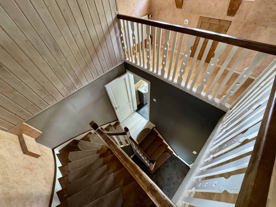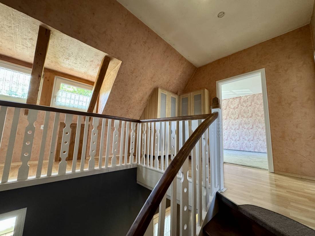 Im Dachgeschoss führt eine elegante, geschwungene Treppe in einen großzügigen Flur, der dank offener Gestaltung besonders einladend wirkt. Hier befinden sich zwei komfortable Zimmer, eines davon als besonderes Ankleidezimmer genutzt. Ein stilvolles Wannenbad, sowie ein kleines Gäste-WC auf halber Höhe sorgen für zusätzlichen Komfort.
