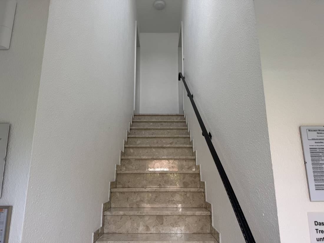 Über das Treppenhaus erreichen Sie den Eingangsbereich. Durch die Wohnungstür treten Sie unmittelbar in das großzügig geschnittene Wohn-und Esszimmer. Ein bodentiefes Fensterelement verbindet hier den Wohnbereich mit dem Balkon.