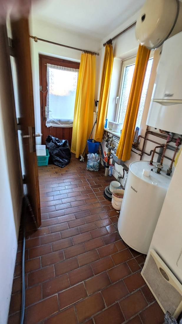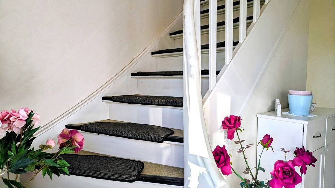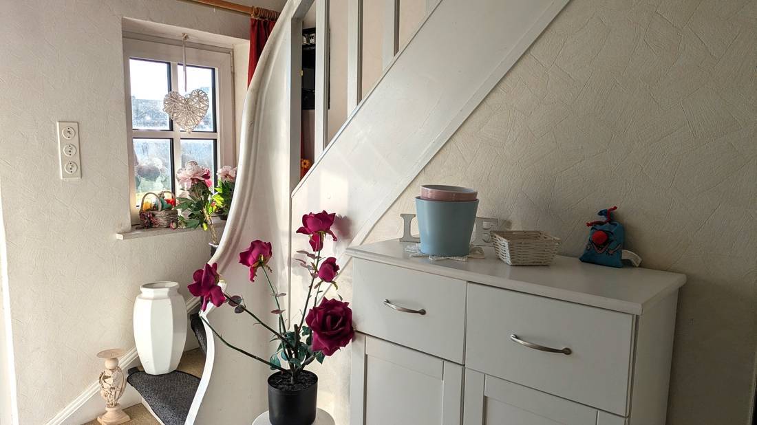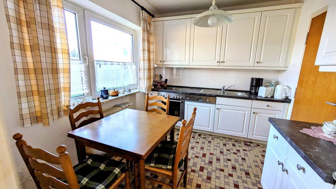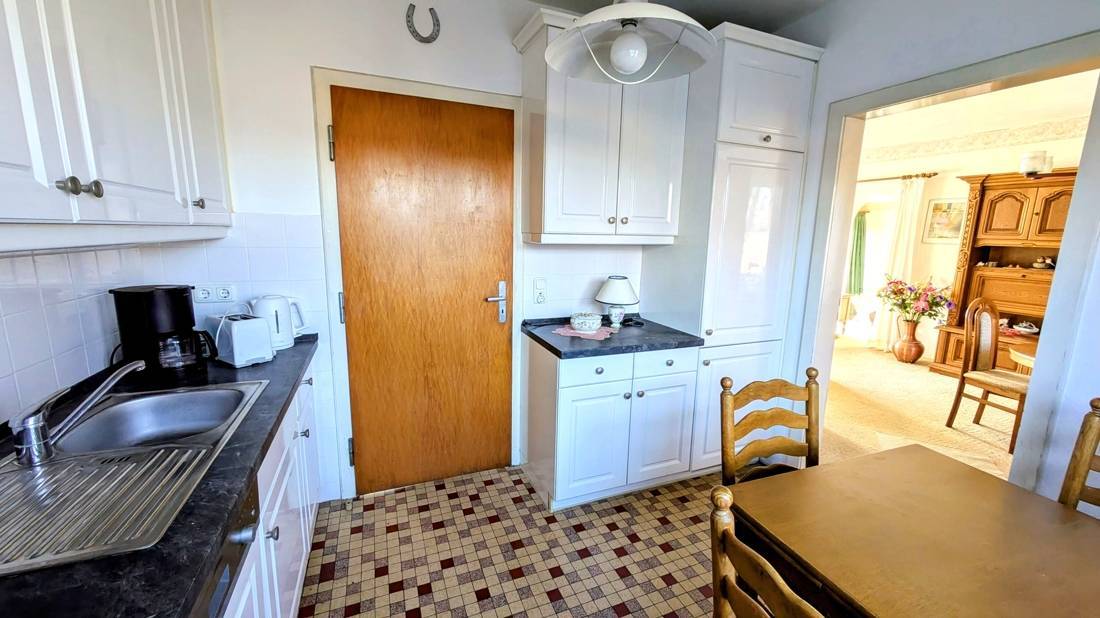 Man betritt das Haus und befindet sich in einem Flur mit hübscher weißer Treppe. Im Erdgeschoss gibt es das gut geschnittene Wohnzimmer mit Fenstern an beiden Seiten. Ein Durchgang führt zum bereits erwähnten Anbauzimmer, das als zweites Wohnzimmer oder z. B. als Esszimmer dienen kann. Vor wenigen Jahren wurde die Küche mit einer weißen Einbauküche ausgestattet. Das kleinste Zimmer im Haus befindet sich ebenfalls im Erdgeschoss und wurde als Kinderzimmer sehr geliebt. Das Erdgeschoss wird komplettiert durch den Heizungsraum mit dahinterliegendem Gäste-Bad mit Dusche. Dieser Bereich wäre als Hauswirtschaftsraum ideal, weil es einen Zugang zum hinteren Teil des Gartens gibt. Über die hübsche weiße Holztreppe gelangt man in das Obergeschoss. Den oberen Treppenabsatz könnte man für eine kleine Arbeitsecke nutzen. Es gibt im Obergeschoss zwei etwa gleich große Zimmer, von denen eines Zugang zum Balkon über dem Anbau hat. Das Badezimmer mit Badewanne befindet sich in der Mitte. Dadurch, dass es im Erdgeschoss genügend Zimmer, Küche und Bad gibt, wäre das Wohnen hier auch für Menschen geeignet, die nicht die Treppe steigen können. Stauraum gibt es reichlich auf dem Grundstück und im Gebäude. Ein kleiner Keller unter der Treppe beherbergt Wasseruhr und nützliche Kleinigkeiten. Der zweite Anbau wurde bei der Wohnflächenberechnung nicht berücksichtigt, hier kann man auch viel unterbringen. Zusätzlich gibt es zwei Garagen, von denen eine als Geräteschuppen und Werkstatt genutzt wird und die andere für PKW.