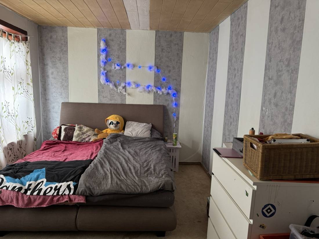 Die Dachgeschosswohnung verfügt über einen separaten Eingang und bietet somit ein hohes Maß an Privatsphäre. Ein zentraler Flur verbindet alle Räume miteinander. Die geräumige Küche mit Essbereich lädt zum Verweilen ein, während das derzeit kombinierte Wohn- und Schlafzimmer durch einen Raumteiler eine behagliche Atmosphäre erhält. Zwei weitere Schlafzimmer sowie ein Duschbad runden das Angebot ab. Der Spitzboden bietet zusätzliche Abstellmöglichkeiten.