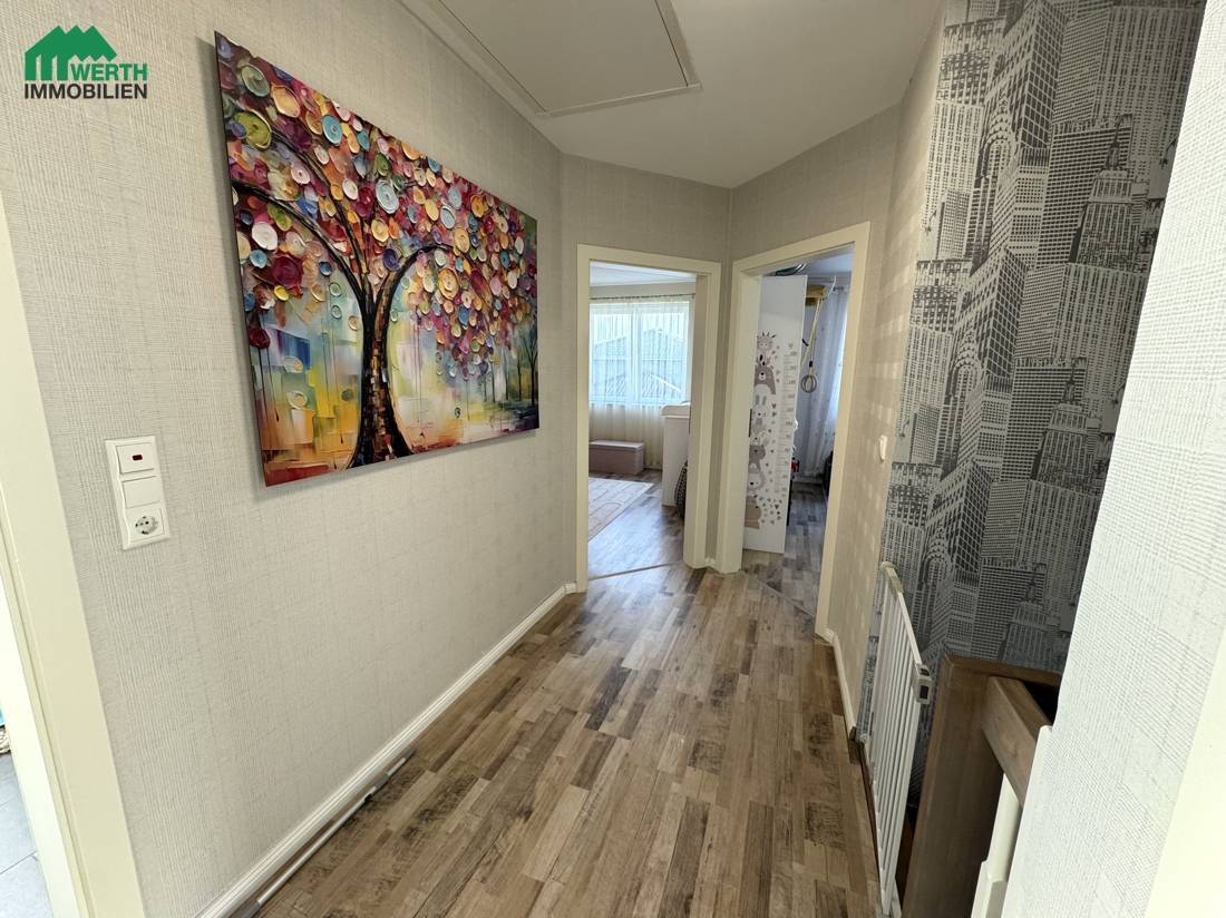 Im Dachgeschoss befinden sich das Elternschlafzimmer, zwei Kinderzimmer sowie eine separate Ankleide, die derzeit direkt über das Schlafzimmer zugänglich ist. Mit einer überschaubaren Umbaumaßnahme kann die Ankleide alternativ über den Flur erschlossen werden. Dadurch ließe sich im Dachgeschoss ein zusätzliches, vollwertiges Zimmer realisieren – ideal als Homeoffice, Gästezimmer oder weiterer Rückzugsraum. Diese flexible Gestaltungsmöglichkeit macht das Haus besonders zukunftsfähig und anpassbar an unterschiedliche Lebensphasen.